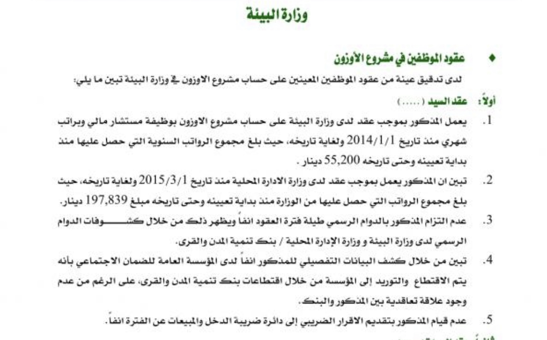 اشار تقرير ديوان المحاسبة السنوي لعام ٢٠٢١ الى ان موظف يعمل على حساب مشروع الاوزون بوزارة البيئة كمستشار مالي تبين لاحقا انه يعمد ايضا بموجب عقد بوزارة الادارة المحلية ويتلقى رواتب من الجهتين !