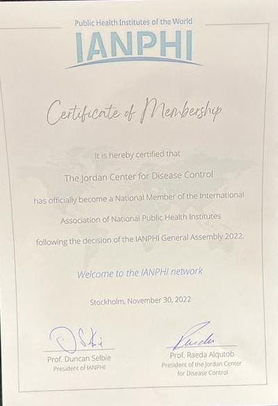 قررت الرابطة الدولية لمؤسسات الصحة العامة الوطنية (IANPHI) قبول المركز الوطني لمكافحة الأوبئة والأمراض السارية (JCDC) عضوا فيها، وذلك خلال اجتماعها السنوي المنعقد حاليا في ستوكهولم بالسويد خلال الفترة من 30 تشرين الثاني وحتى 2 كانون أول 2022 بمشاركة 115 مشاركا من 115 دولة أعضاء حضروا وجاهيا و115 دولة شاركت عن بُعد عبر الاتصال المرئي .