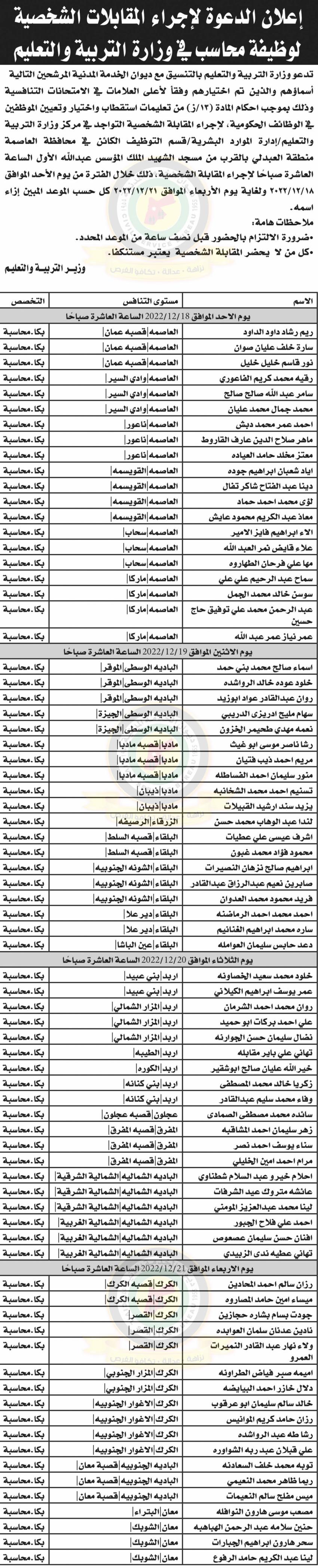 وذلك بموجب احكام المادة (۱۳ ز) من تعليمات استقطاب واختيار وتعيين الموظفين في الوظائف الحكومية، لإجراء المقابلة الشخصية التواجد في مركز وزارة التربية والتعليم / إدارة الموارد البشرية / قسم التوظيف الكائن في محافظة العاصمة منطقة العبدلي بالقرب من مسجد الشهيد الملك المؤسس عبدالله الأول الساعة العاشرة صباح يوم غد الأحد الموافق 18 كانون الأول 2022 ولغاية يوم الأربعاء الموافق 21 كانون الأول 2022،، وذلك لإجراء المقابلة الشخصية.