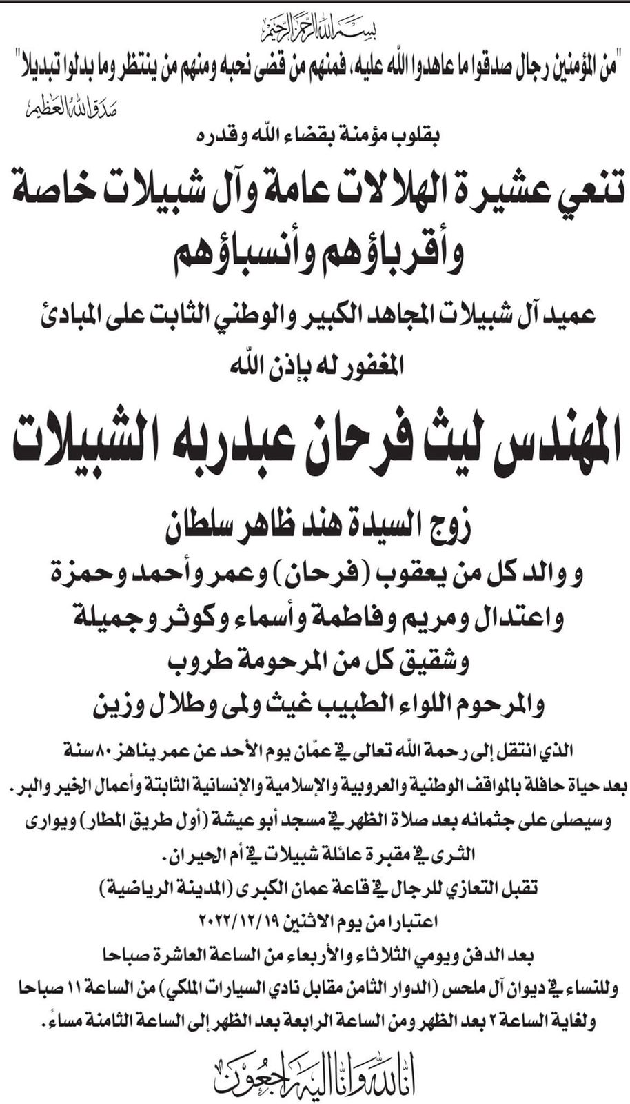 تقبل التعازي للرجال في قاعة عمان الكبرى (المدينة الرياضية) اعتبارا من يوم الاثنين 2022/12/19 بعد الدفن ويومي الثلاثاء والاربعاء من الساعة العاشرة صباحاً وللنساء في ديوان ال ملحس (الدوار الثامن مقابل نادي السيارات الملكي) من الساعة ١١ صباحا ولغاية الساعة ٢ بعد الظهر ومن الساعة الرابعة بعد الظهر الى الساعة الثامنة مساء.
