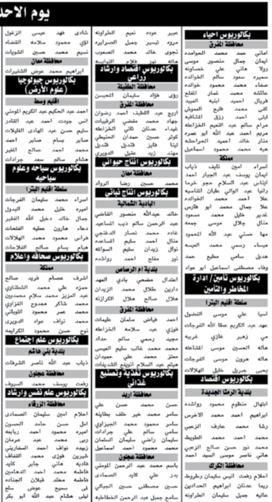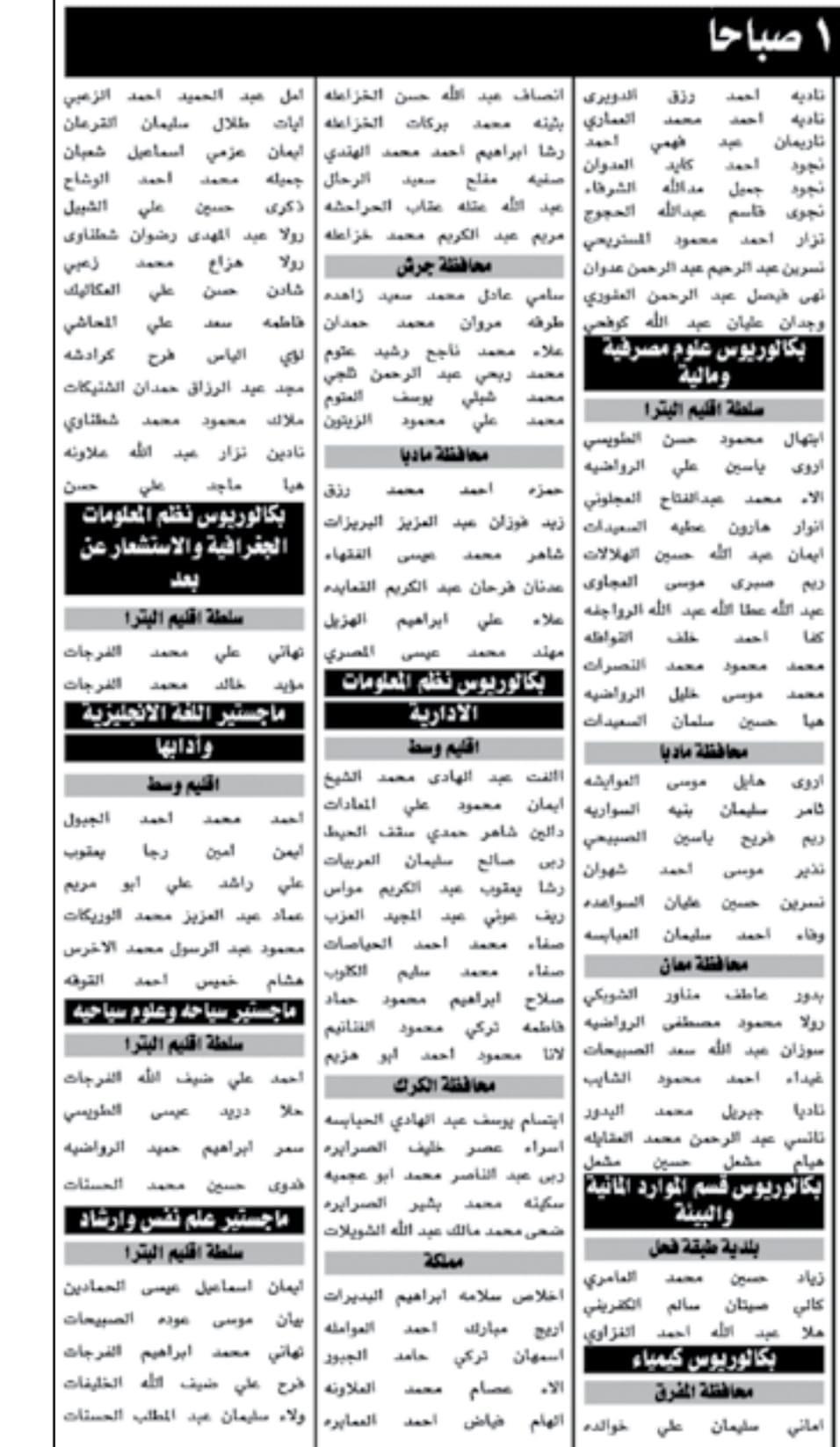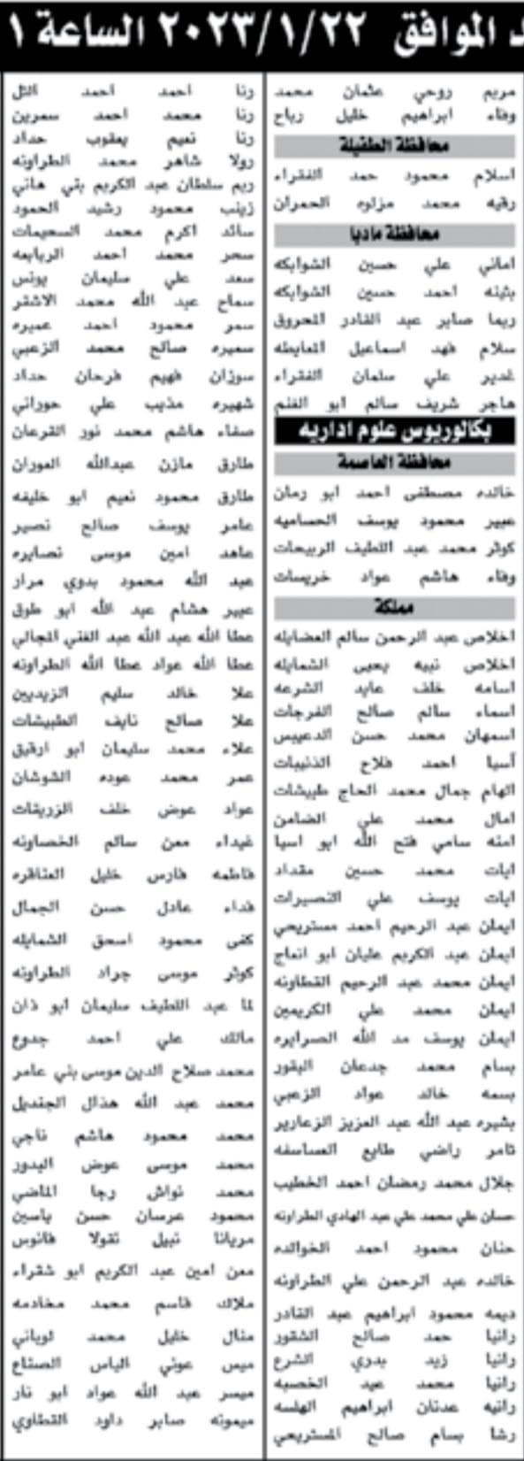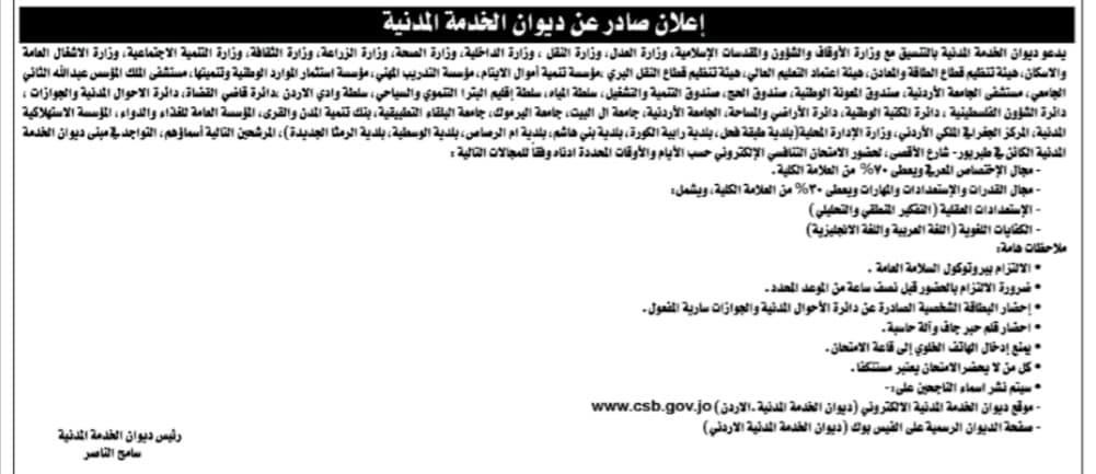 دعا ديوان الخدمة المدنية بالتنسيق مع وزارة الاوقاف والشؤون والمقدسات الإسلامية؛ وزارة العدل، وزارة النقل؛ وزارة الداخلية، وزارة الصحة، وزارة الزراعة؛ وزارة الثقافة؛ وزارة التنمية الاجتماعية، وزارة الاشغال العامة والاسكان، هيئة تنظيم قطاع الطاقة والمعادن؛ هيئة اعتماد التعليم العالي، هيئة تنظيم قطاع النقل البري، مؤسسة تنمية أموال الايتام، مؤسسة التدريب المهني، مؤسسة استثمار الموارد الوطنية وتنميتها، مستشفى الملك المؤسس، مستشفى الجامعة الأردنية، صندوق المعونة الوطنية؛ صندوق الحح؛ صندوق التنمية والتشغيل؛ سلطة المياه؛ سلطة إقليم البترا التنموي والسياحي؛ سلطة وادي الاردن، دائرة قاضي القضاة، دائرة الاحوال المدنية والجوازات، دائرة الشؤون الفلسطينية؛ دائرة المكتبة الوطنية؛ دائرة الأراضي والمساحة، الجامعة الأردنية؛ جامعة ال البيت، جامعة اليرموك، جامعة البلقاء التطبيقية؛ بنك تنمية المدن والقرى، المؤسسة العامة للغذاء والدواء ؛ المؤسسة الاستهلاكية المدنية، المركز الجغرافي الملكي الأردني؛ وزارة الإدارة المحلية (بلدية طبقة فحل؛ بلدية رابية الكورة؛ بلدية بني هاشم، بلدية ام الرصاص، بلدية الوسطية؛ بلدية الرمثا الجديدة)؛ المرشحين التالية أسماؤهم، التواجد في مبنى ديوان الخدمة المدنية؛ لحضور الامتحان التنافسي الإلكتروني حسب الايام والأوقات المحددة ادناه وفقا للمجالات التالية: