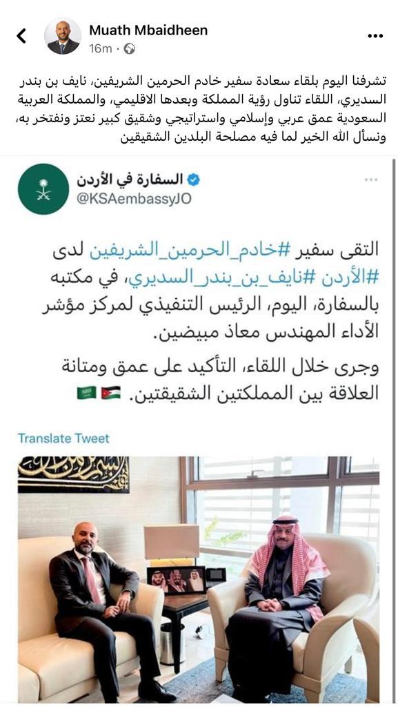 المبيضين: المملكة العربية السعودية عمق عربي وإسلامي واستراتيجي وشقيق كبير نعتز ونفتخر به، ونسأل الله الخير لما فيه مصلحة البلدين الشقيقين.