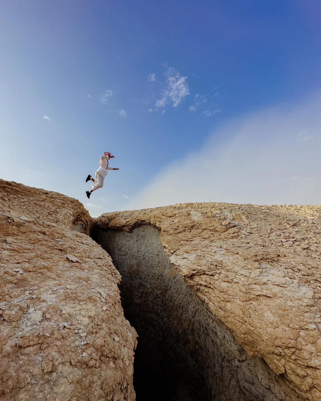 وفي إحدى الصور التي التقطها السبيعي بعدسة كاميرته، يظهر صديقه وهو يقفز من فوق شق جبل القارة