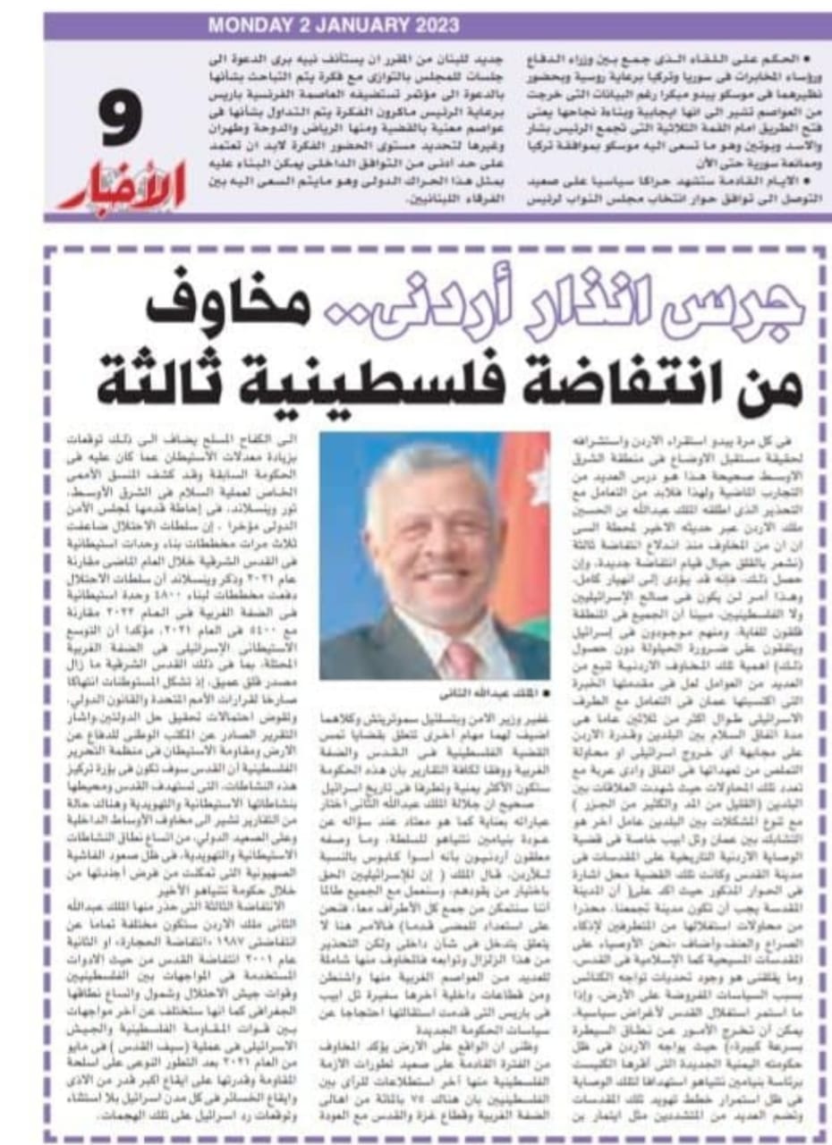 في كل مرة يبدو استقراء الاردن واستشرافه لحقيقة مستقبل الاوضاع في منطقة الشرق الاوسط صحيحة هذا هو درس العديد من التجارب الماضية ولهذا فلابد من التعامل مع التحذير الذي اطلقه الملك عبدالله بن الحسين ملك الاردن عبر حديثه الاخير لمحطة السي ان ان من المخاوف من اندلاع انتفاضة ثالثة (نشعر بالقلق حيال قيام انتفاضة جديدة، وإن حصل ذلك، فإنه قد يؤدي إلى انهيار كامل، وهذا أمر لن يكون في صالح الإسرائيليين ولا الفلسطينيين، مبينا أن الجميع في المنطقة قلقون للغاية، ومنهم موجودون في إسرائيل ويتفقون على ضرورة الحيلولة دون حصول ذلك) اهمية تلك المخاوف الاردنية تنبع من العديد من العوامل لعل في مقدمتها الخبرة التي اكتسبتها عمان في التعامل مع الطرف الاسرائيلي طوال اكثر من ثلاثين عاما هي مدة اتفاق السلام بين البلدين وقدرة الاردن علي مجابهة أي خروج اسرائيلي او محاولة التملص من تعهداتها في اتفاق وادي عربة مع تعدد تلك المحاولات حيث شهدت العلاقات بين البلدين (القليل من المد والكثير من الجزر ) مع تنوع المشكلات بين البلدين عامل آخر هو التشابك بين عمان وتل ابيب خاصة في قضية الوصاية الاردنية التاريخية علي المقدسات في مدينة القدس وكانت تلك القضية محل اشارة في الحوار المذكور حيث اكد على( أن المدينة المقدسة يجب أن تكون مدينة تجمعنا، محذرا من محاولات استغلالها من المتطرفين لإذكاء الصراع والعنف.وأضاف "نحن الأوصياء على المقدسات المسيحية كما الإسلامية في القدس، وما يقلقني هو وجود تحديات تواجه الكنائس بسبب السياسات المفروضة على الأرض، وإذا ما استمر استغلال القدس لأغراض سياسية، يمكن أن تخرج الأمور عن نطاق السيطرة بسرعة كبيرة") حيث يواجه الاردن في ظل حكومته اليمنية الجديدة التي اقرها الكنيست برئاسة بنيامين نتنياهو استهدافا لتلك الوصاية في ظل استمرار خطط تهويد تلك المقدسات وتضم العديد من المتشددين مثل ايتمار بن غفير وزير الامن وبتسلئيل سموتريتش وكلاهما اضيف لهما مهام آخري تتعلق بقضايا تمس القضية الفلسطينين في القدس والضفة الغربية ووفقا لكافة التقارير بان هذه الحكومة ستكون الأكثر يمنية وتطرفا في تاريخ اسرائيل