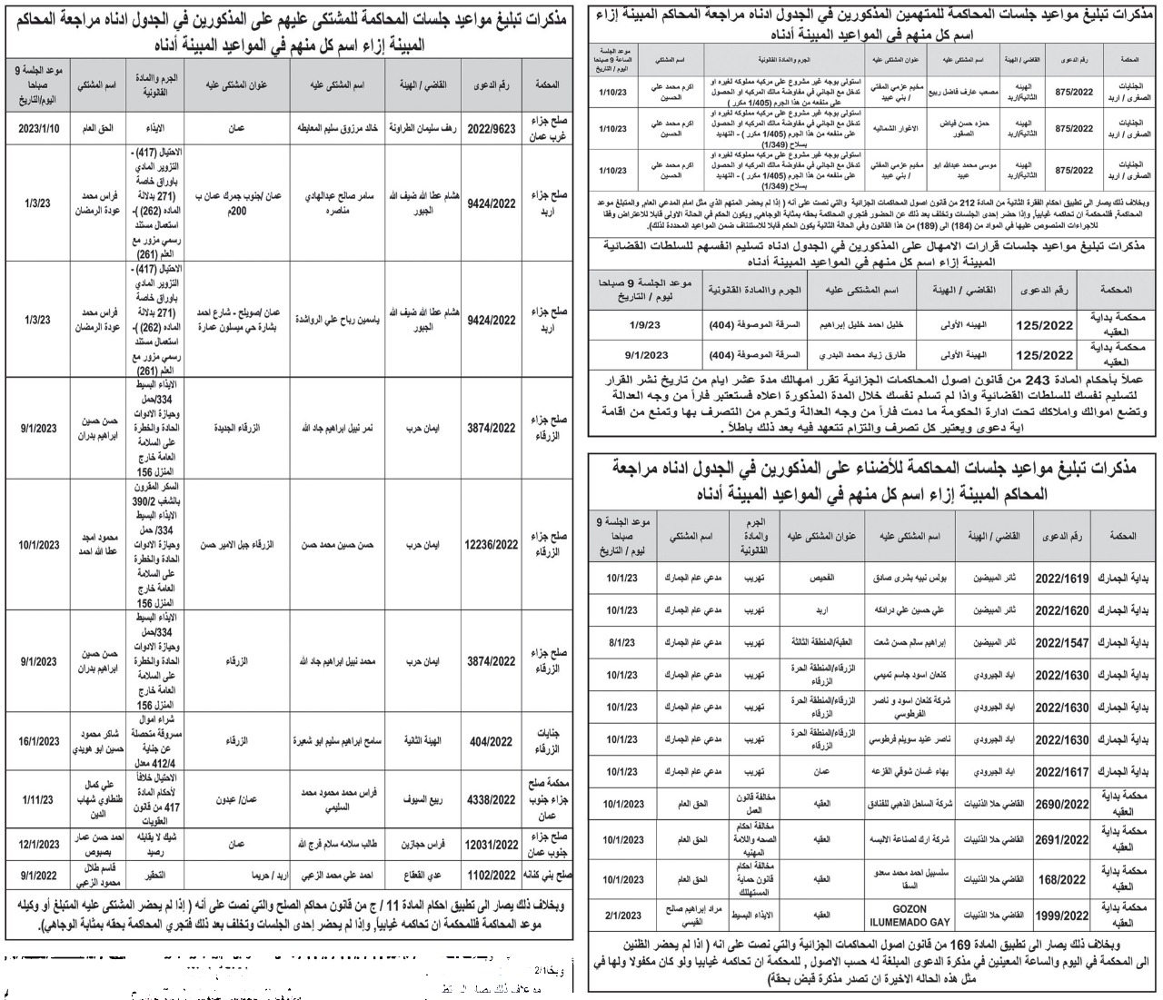 نشرت عدد من المحاكم الأردنية، إعلانات في الصحف اليومية تضمنت مذكرات تبليغ لمتهمين، فيها أمهلت متهمين آخرين 10 أيَّام لتسليم أنفسهم للسلطات القضائية لمحاكمتهم على التهم المسندة إليهم، وإلا سيتم اعتبارهم فارين من وجه العدالة.
