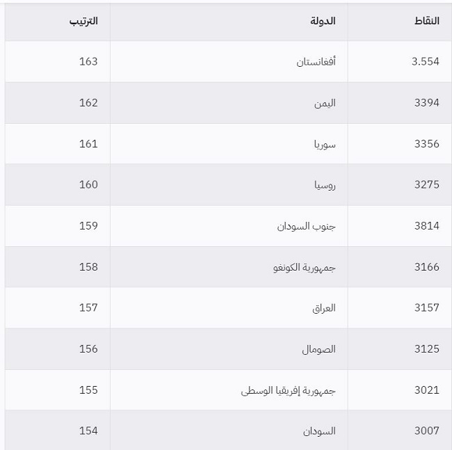 أما من ناحية الدول الأقل أماناً فنجد أفغانستان في ذيل القائمة يليها اليمن ثم سوريا، وتوجد 6 دول عربية في قائمة الدول الـ10 الأقل أماناً في العالم.