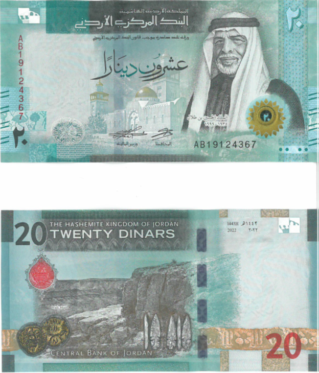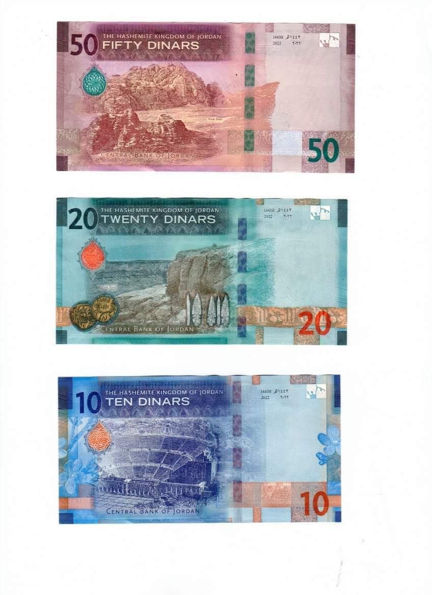 نشر البنك المركزي الأردني اليوم السبت الموافق 7/1/2023 على موقعه الإلكتروني صوراً لباقي فئات أوراق النقد الأردني/الإصدار الخامس (خمسون ديناراً، عشرون ديناراً، عشرة دنانير وخمسة دنانير).