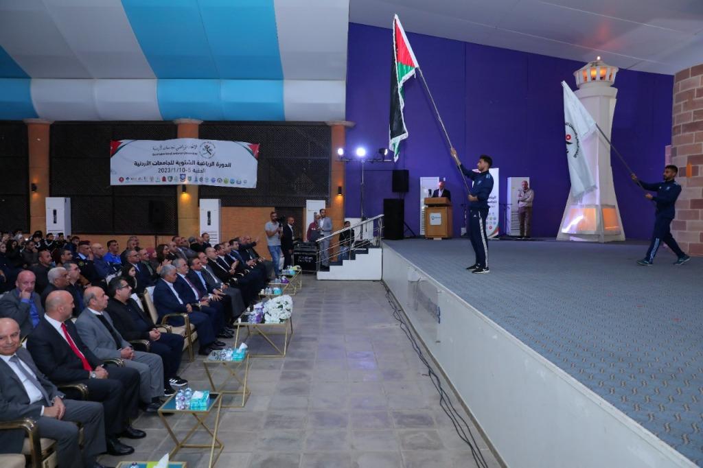 وبدأ الحفل بدخول علم المملكة الأردنية الهاشمية وعلم الاتحاد الرياضي للجامعات الأردنية وأعلام الجامعات المشاركين في الدورة الرياضية الشتوية للجامعات الأردنية 2023.