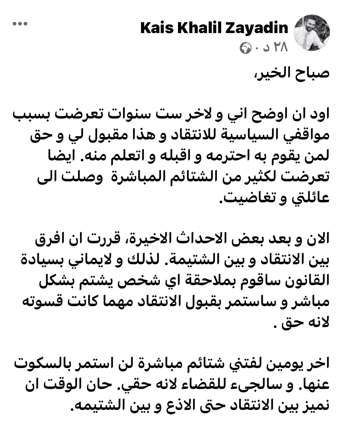 اود ان اوضح اني و لاخر ست سنوات تعرضت بسبب مواقفي السياسية للانتقاد و هذا مقبول لي و حق لمن يقوم به احترمه و اقبله و اتعلم منه. ايضا تعرضت لكثير من الشتائم المباشرة وصلت الى عائلتي و تغاضيت.