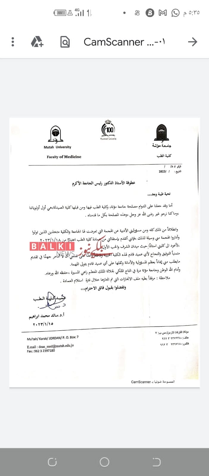 عميد كلية الطب بجامعة مؤتة لبلكي نيوز : تقدمت باستقالتي من عمادة الكلية لاسباب خاصة . (وثيقة )