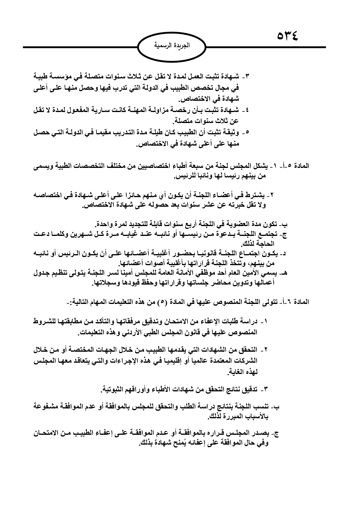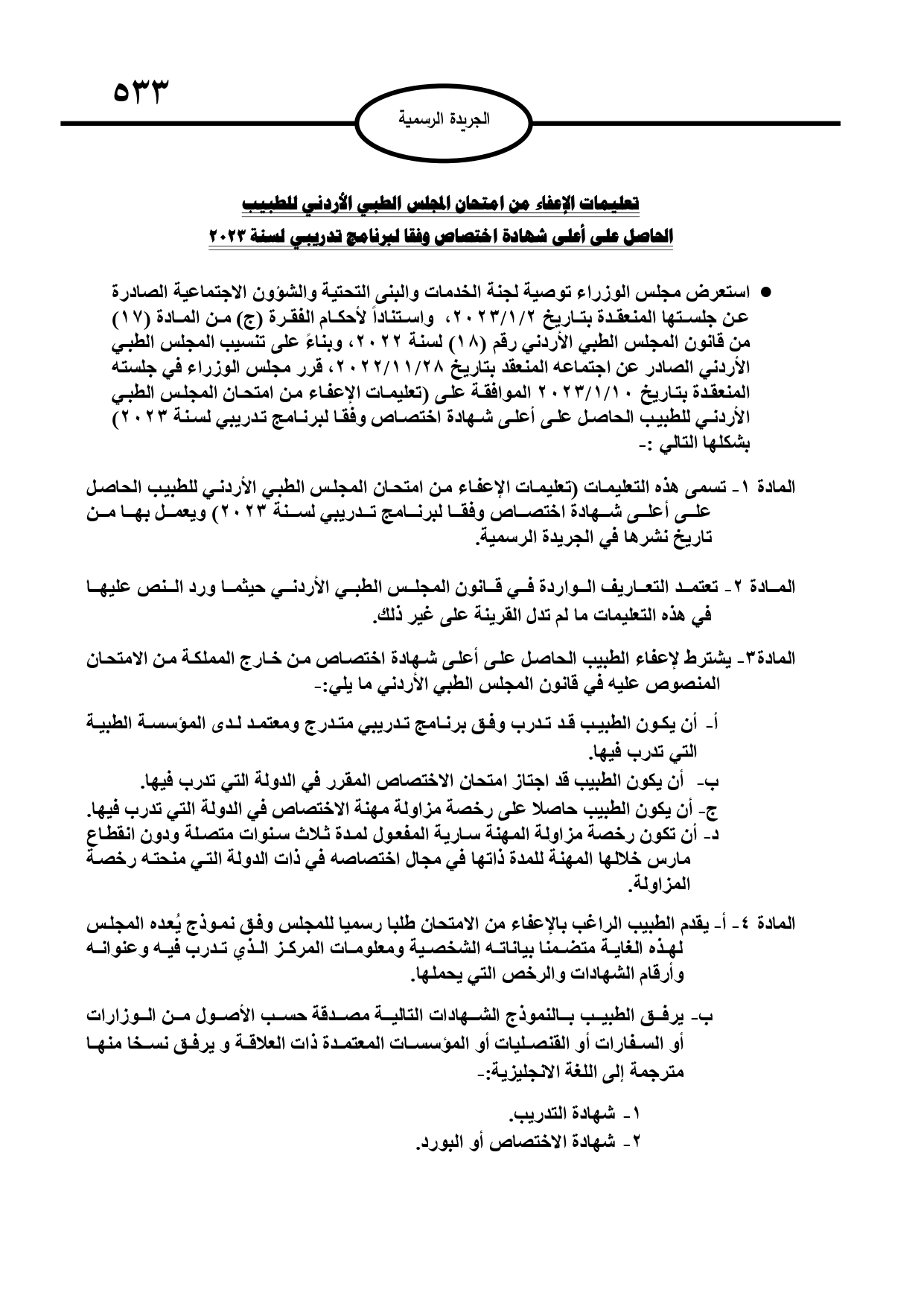 صدرت في الجريدة الرسمية، مساء الأربعاء، تعليمات الإعفاء من امتحان المجلس الطبي الأردني للطبيب الحاصل على أعلى شهادة اختصاص وفقا لبرنامج تدريبي لسنة 2023.