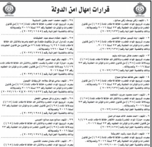 أمهلت محكمة أمن الدولة متهمين، 10 أيام من تاريخه، لتسليم أنفسهم للسلطات القضائية المختصة لمحاكمتهم على التهم المسندة إليهم، وإلا سيتم اعتبارهم فارين من وجه العدالة، وتوضع أموالهم تحت إدارة الحكومة ويحرمون من التصرف بها ويمنعون من إقامة أية دعاوى ويعتبر كل تصرف يقومون به أو التزام يتعهدون به بعد ذلك باطلا.