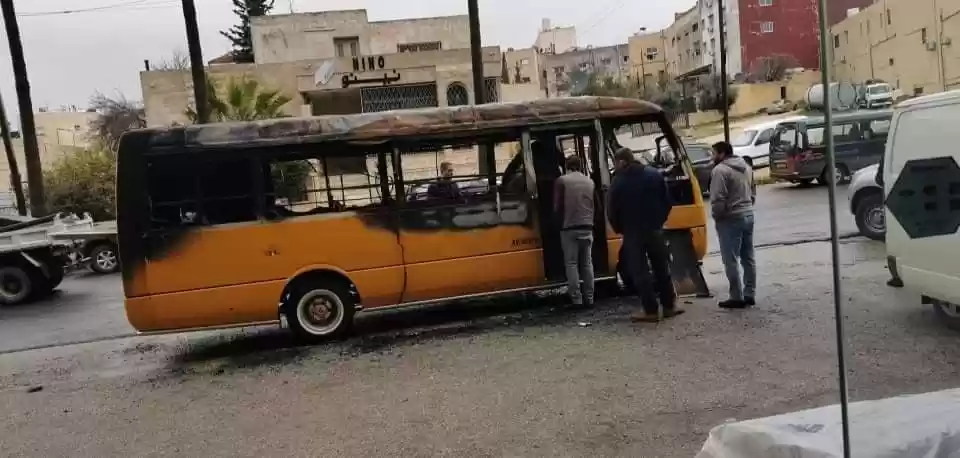 اندلعت النيران بحافلة مدرسية كانت متوقفة صباح اليوم الأحد في منطقة خلدا - أم السماق بالعاصمة عمان.