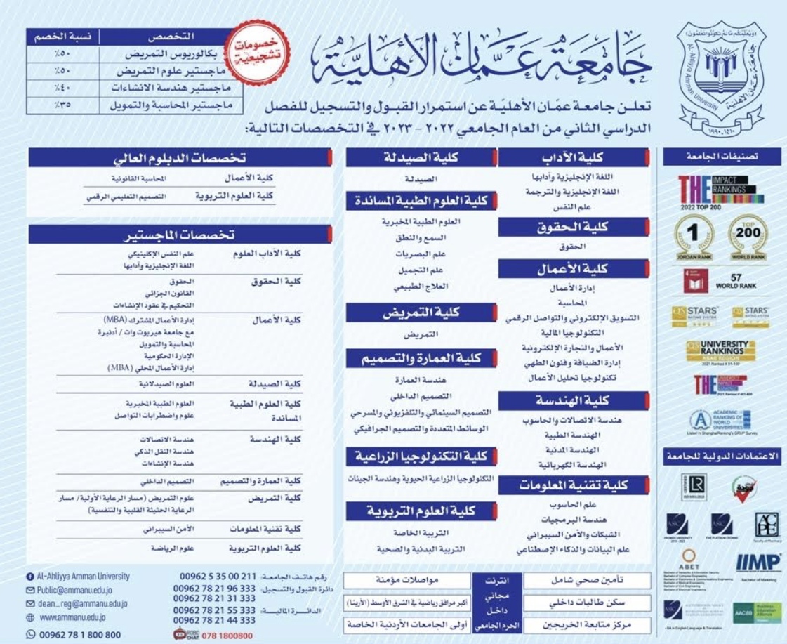 تعلن جامعة عمان الأهلية عن استمرار القبول والتسجيل للفصل الدراسي الثاني من العام الجامعي 2022 - 2023 في التخصصات التالية :
