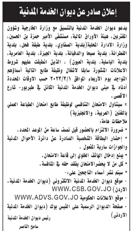 دعت مؤسسات حكومية وبالتنسيق مع ديوان الخدمة المدنية، الخميس، عدداً من المرشحين لمراجعتها لاستكمال إجراءات التعيين.