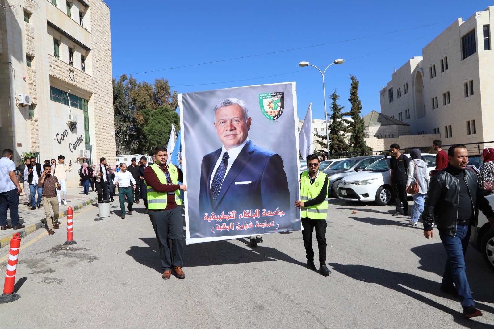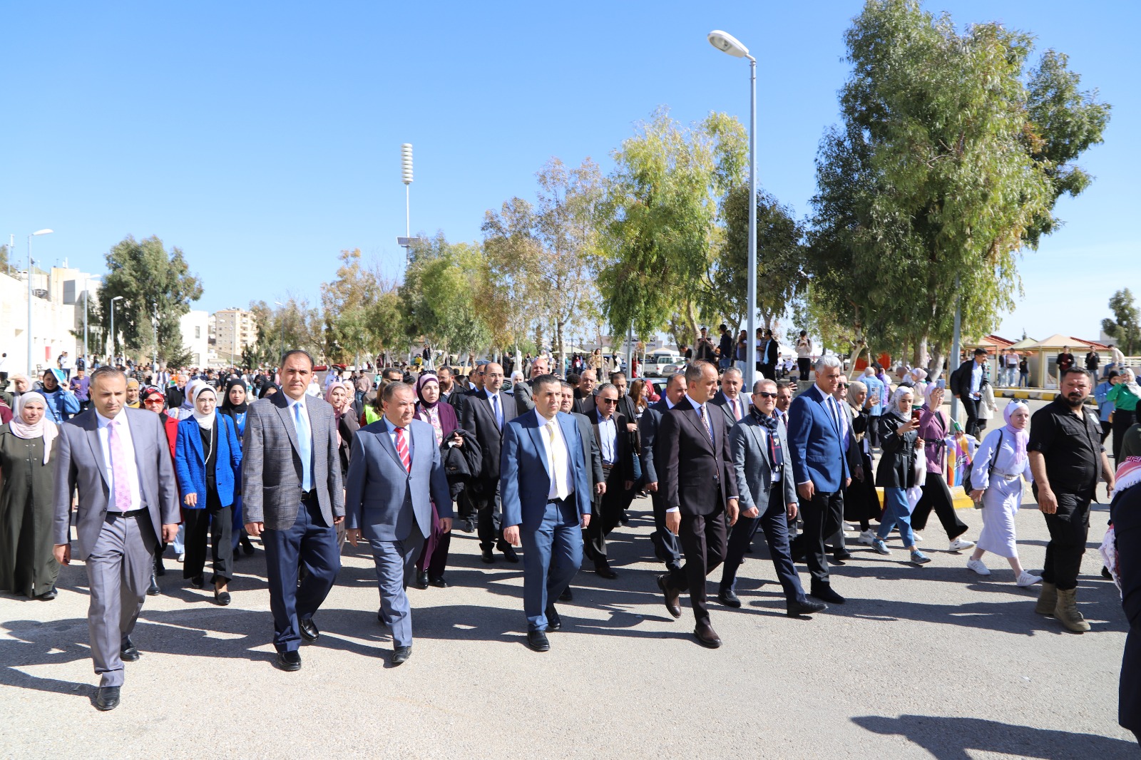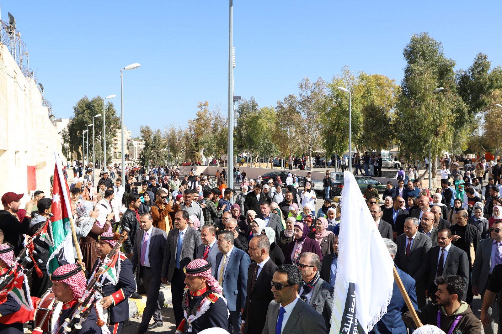 وكان قد بدأ الاحتفال بمسيرة انطلقت من أمام رئاسة الجامعة تقدمها رئيس الجامعة ونواب الرئيس وعمداء الكليات والطلبة بمرافقة موسيقات القوات المسلحة الأردنية والتي عزفت المقطوعات الموسيقية الاردنية ورفع خلالها الطلبة صور لجلالة الملك المفدى وعلم الأردن.