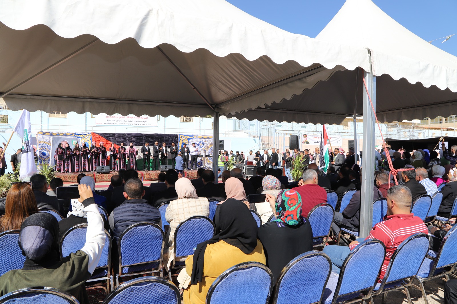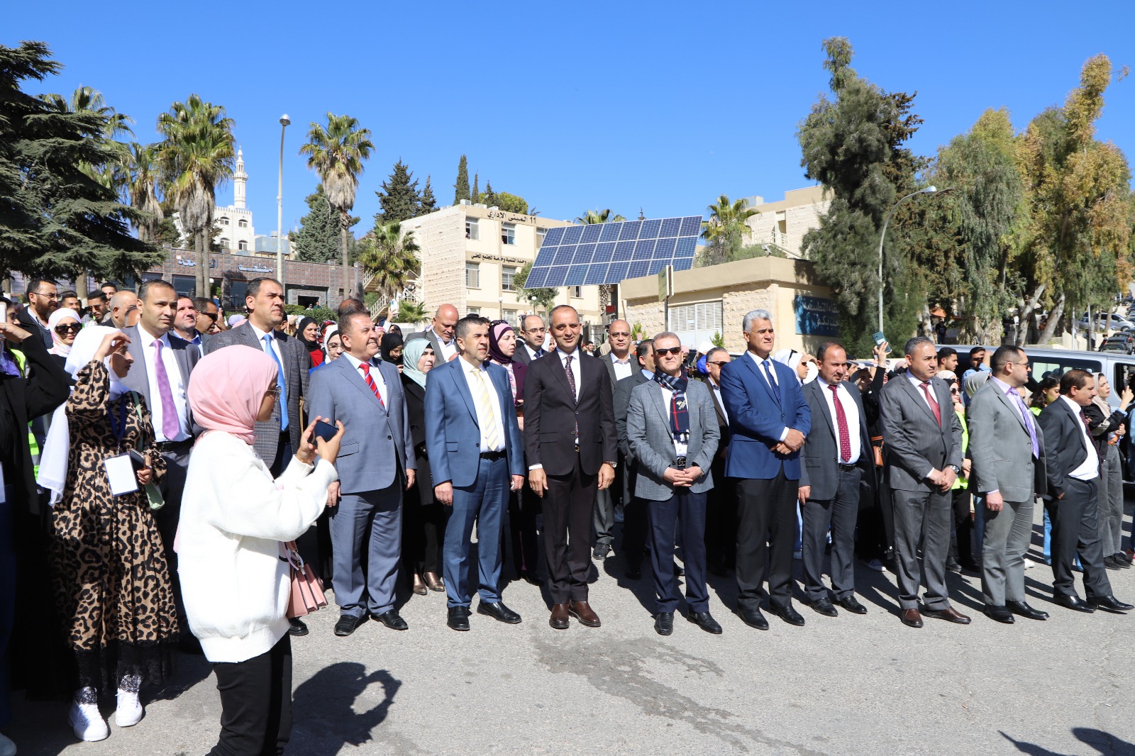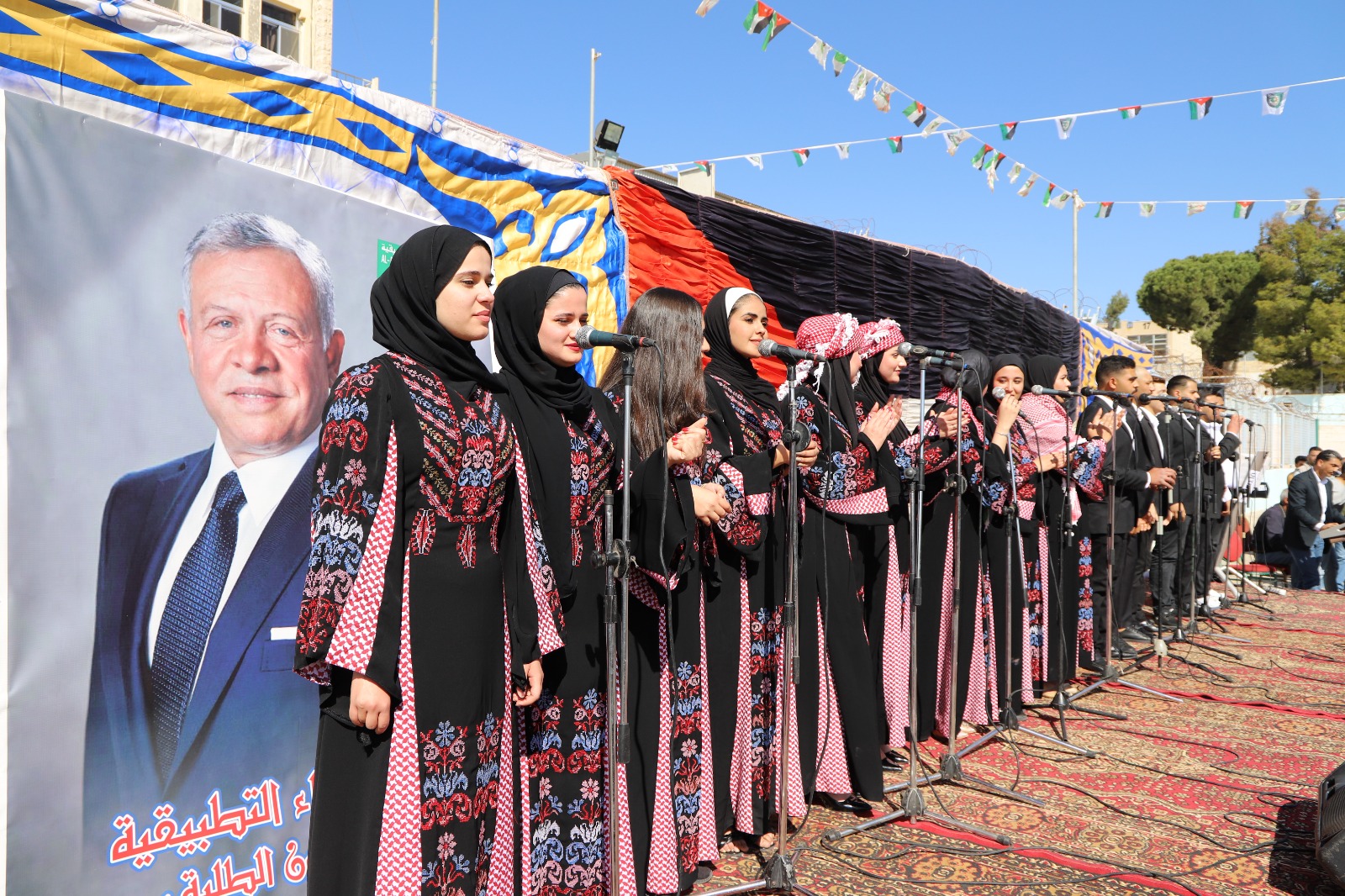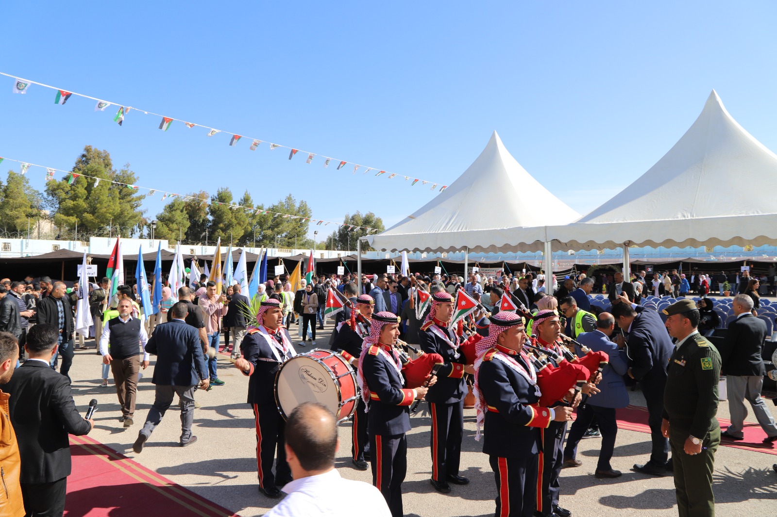 وكان قد بدأ الاحتفال بمسيرة انطلقت من أمام رئاسة الجامعة تقدمها رئيس الجامعة ونواب الرئيس وعمداء الكليات والطلبة بمرافقة موسيقات القوات المسلحة الأردنية والتي عزفت المقطوعات الموسيقية الاردنية ورفع خلالها الطلبة صور لجلالة الملك المفدى وعلم الأردن.