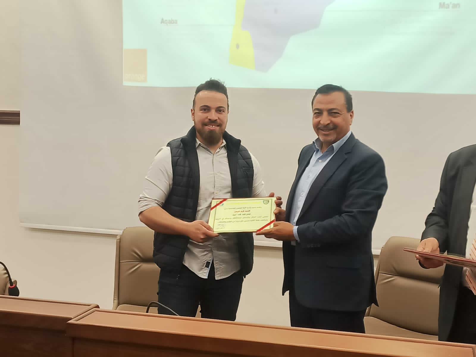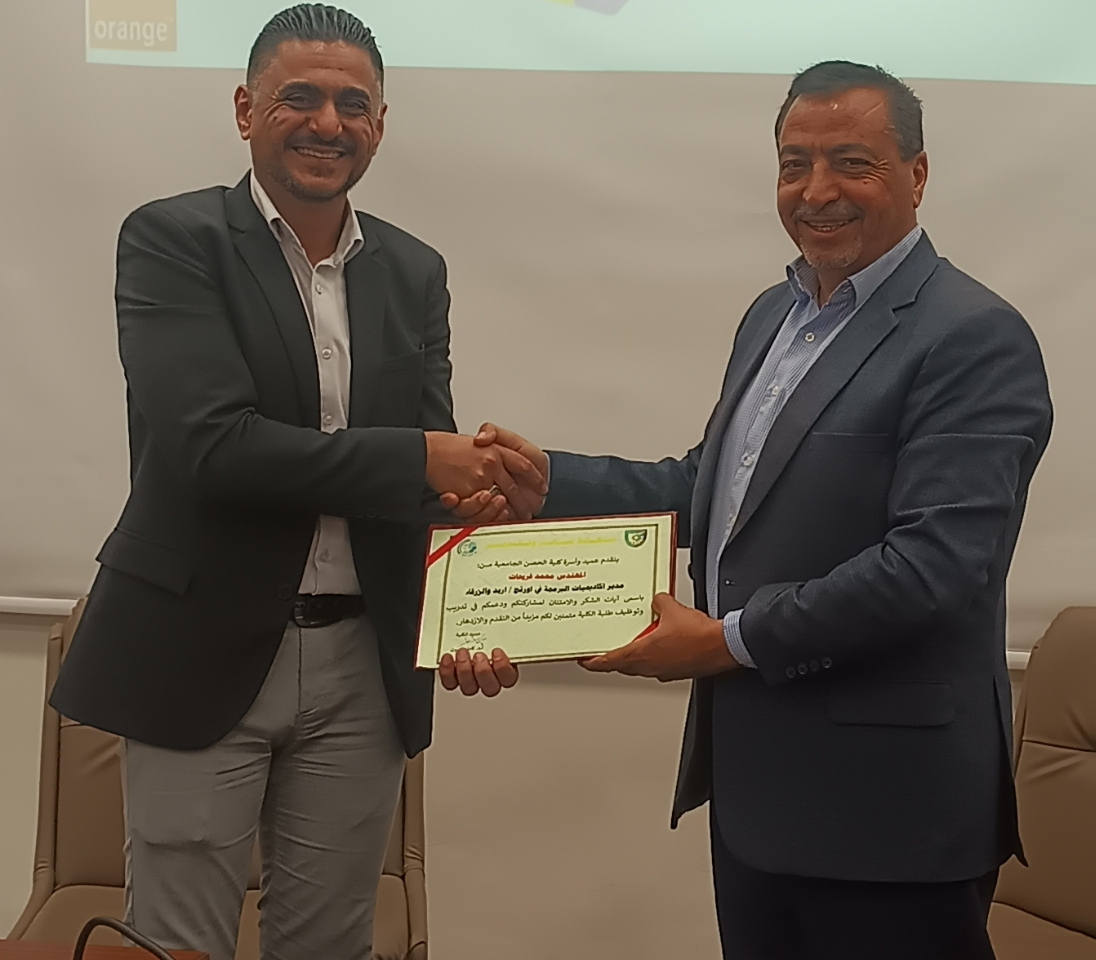وفي ختام اللقاء قدم عميد كلية الحصن الجامعية الاستاذ الدكتور كامل الزبون التكريم لأسرة أكاديمية أورنج للبرمجة وللمحاضرين متوجها بالشكر والتقدير على اتاحة هذه الفرصة أمام الطلبة للتدريب والتوظيف مؤكدا ان أبواب الكلية ستبقى مفتوحة دائما أمام كل شركات القطاع الخاص بما يعود بالفائدة على طلبة الكلية.