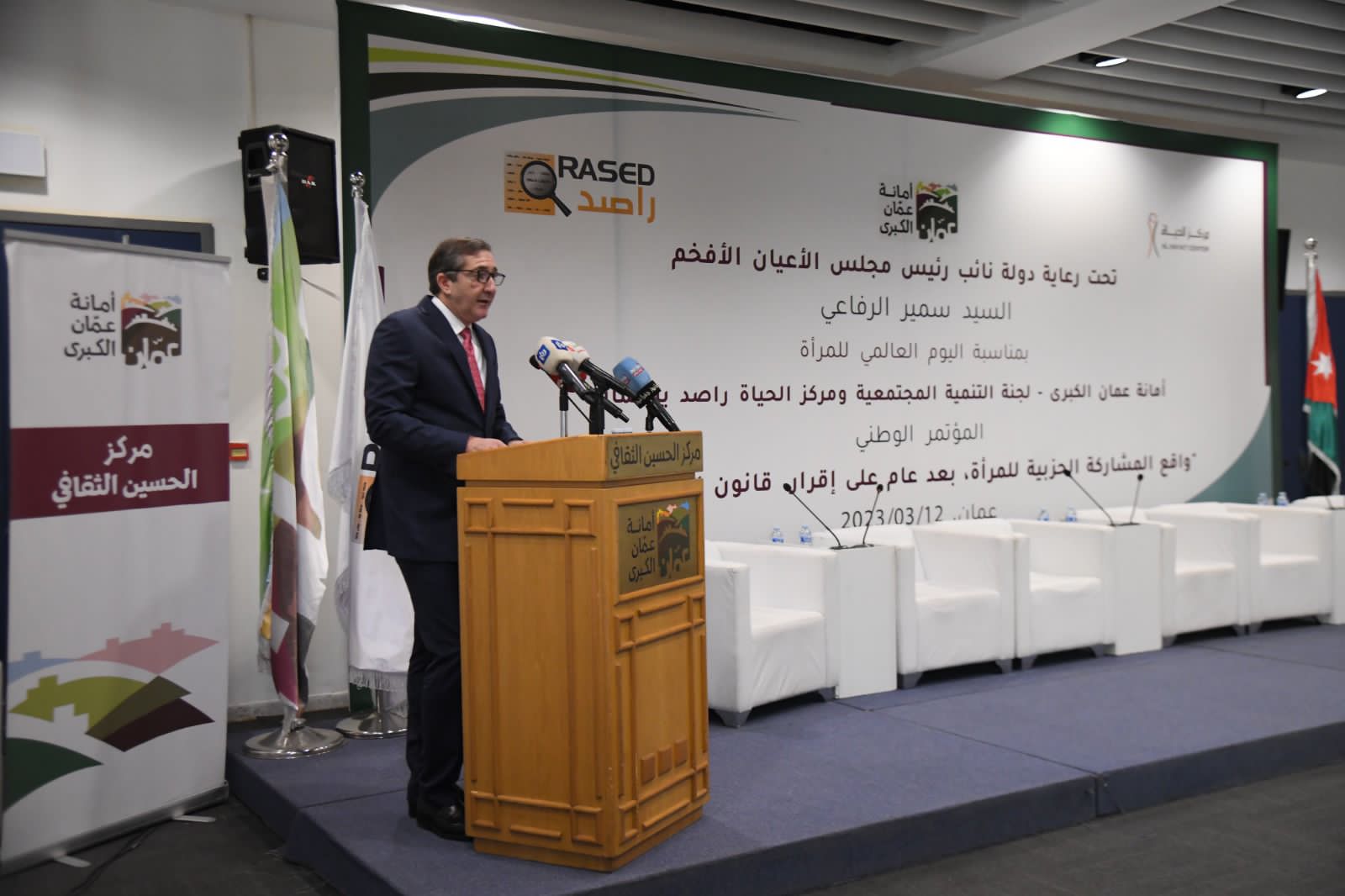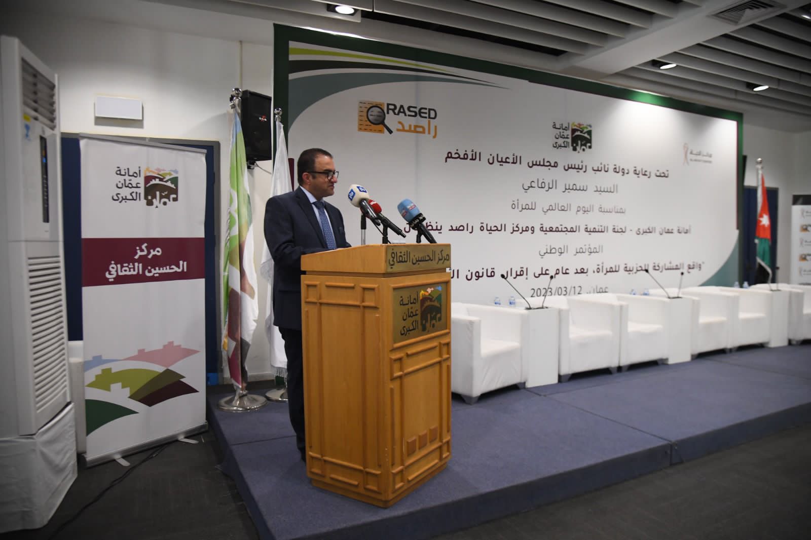 تحت رعاية دولة نائب رئيس مجلس الأعيان سمير الرفاعي نفذ مركز الحياة – راصد بالتعاون مع أمانة عمان الكبرى – اللجنة المجتمعية مؤتمراً وطنياً بمناسبة يوم المرأة العالمي تحت عنوان "واقع المشاركة الحزبية للمرأة، بعد عام على إقرار قانون الأحزاب 2022 من قبل البرلمان الأردني"، وبحضور أمين عام وزارة الشؤون السياسية والبرلمانية الدكتور علي الخوالدة، وحضور عدد من النخب السياسية والحزبية والنسائية والشبابية من مختلف القطاعات والمحافظات، ويأتي هذا المؤتمر انسجامًا مع رؤية الدولة الأردنية في التحديث الشامل، المتمثل في تحديث المنظومات السياسية والاقتصادية والإدارية، ومتوائمًا مع مخرجات اللجنة الملكية لتحديث المنظومة السياسية.