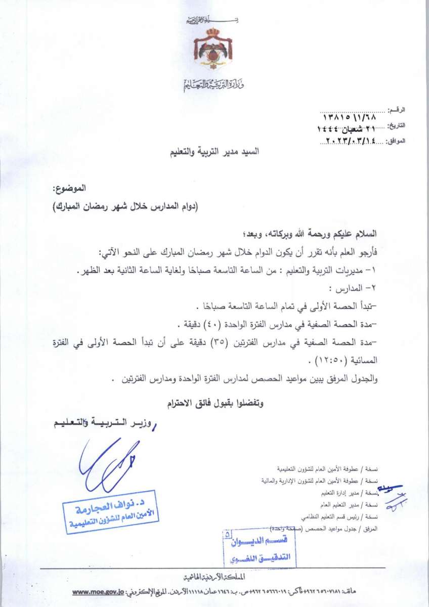 أعلنت وزارة التربية والتعليم أوقات الدوام للمديريات والمدارس خلال شهر رمضان المبارك، حيث يبدأ دوام الموظفين في مديريات التربية والتعليم الساعة التاسعة صباحا ولغاية الساعة الثانية بعد الظهر.