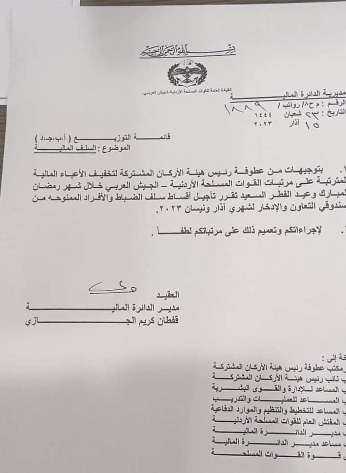 قرر رئيس هيئة الاركان المشتركة تأجيل اقساط سلف الضباط والافراد الممنوحة لهم من صندوقي التعاون والادخار لشهري آذار ونيسان