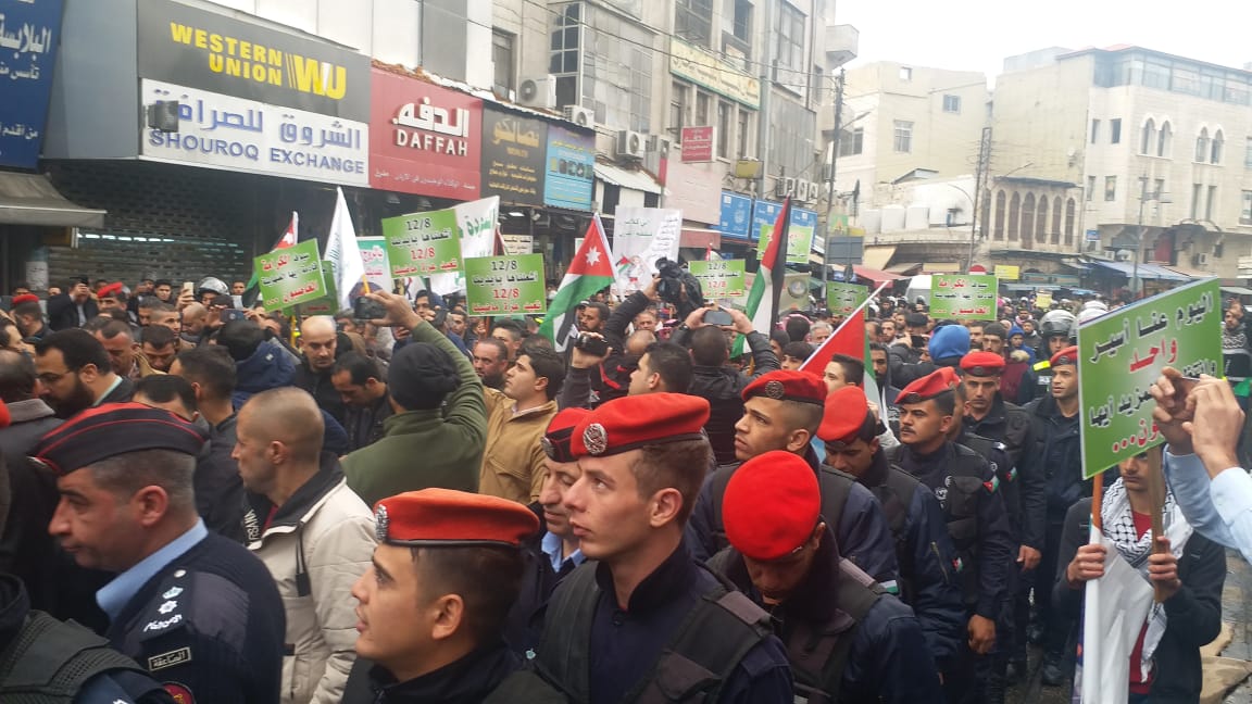 وكان التحالف الوطني لمجابهة صفقة القرن قد دعا للمسيرة في ذكرى "إعلان ترامب المشؤوم لتزوير هوية القدس" تحت عنوان "بدفاعنا عن القدس نحمي الأردن"