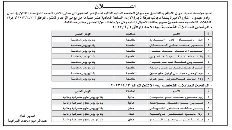 أعلنت عدد من المؤسسات الحكومية اليوم الثلاثاء، بالتنسيق مع ديوان الخدمة المدنية، عن حاجتها لتعبيئة وظائف شاغرة، كما دعت عدد من المرشحين لإجراء المقابلات الشخصية .