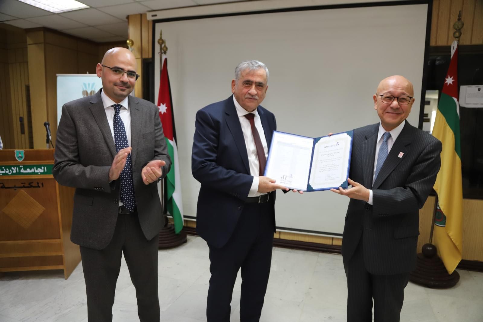 وجاء ذلك خلال حفل إهداء رسمي أُقيم لهذا الغرض في بهو مكتبة الجامعة، برعاية رئيس الجامعة الدكتور نذير عبيدات، وحضور السفير الياباني لدى المملكة جيرو أوكوياما ونائب رئيس الجامعة لشؤون الكليات الإنسانية الدكتور سلامة النعيمات ومدير وحدة المكتبة الدكتور مجاهد الذنيبات.