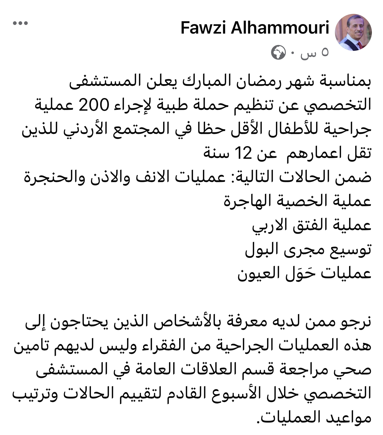 بمناسبة شهر رمضان المبارك يعلن المستشفى التخصصي عن تنظيم حملة طبية لإجراء 200 عملية جراحية للأطفال الأقل حظا في المجتمع الأردني للذين تقل اعمارهم عن 12 سنة
