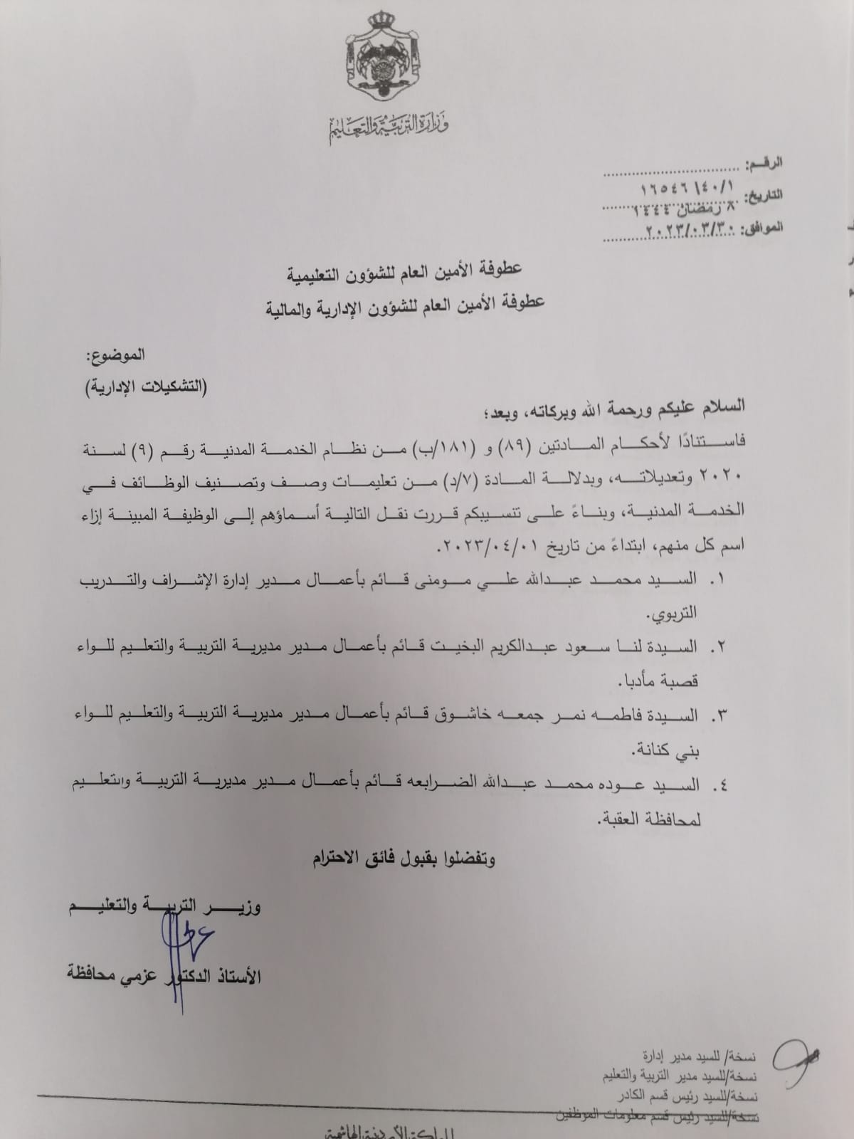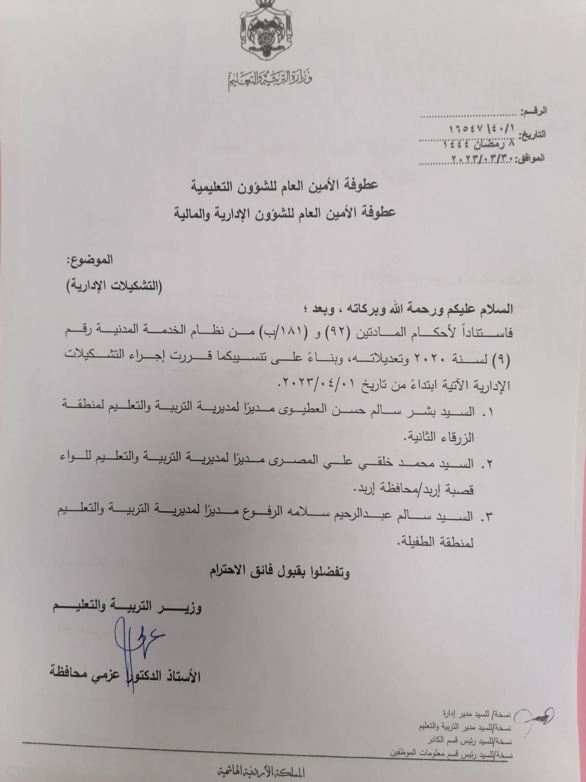 قرر وزير التربية والتعليم الدكتور عزمي المحافظة اجراء عدد من التشكيلات الإدارية والاحالات على التقاعد في وزارة التربية والتعليم.