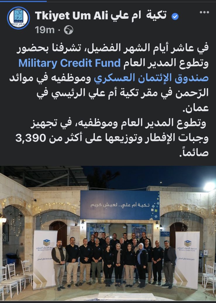 انطلاقا من المسؤولية الاجتماعية ، فقد قرر مدير عام صندوق الإئتمان العسكري مهند شحادة وكوادر الصندوق استبدال الافطار الرمضاني السنوي بالتطوع في تجهيز وجبات الافطار في تكية ام علي وتوزيعها عبر اكثر من 3390 صائم