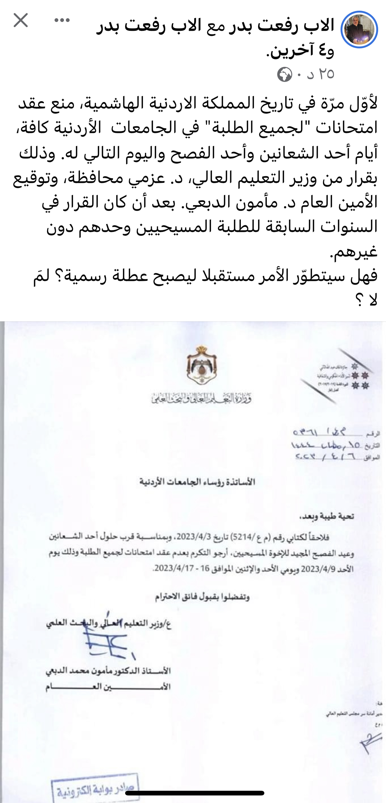 الاب رفعت بدر : هل سيتطور قرار المحافظة بمنع عقد امتحانات لجميع طلبة الجامعات بأحد الشعانين والفصح الى قرار عطلة رسمية