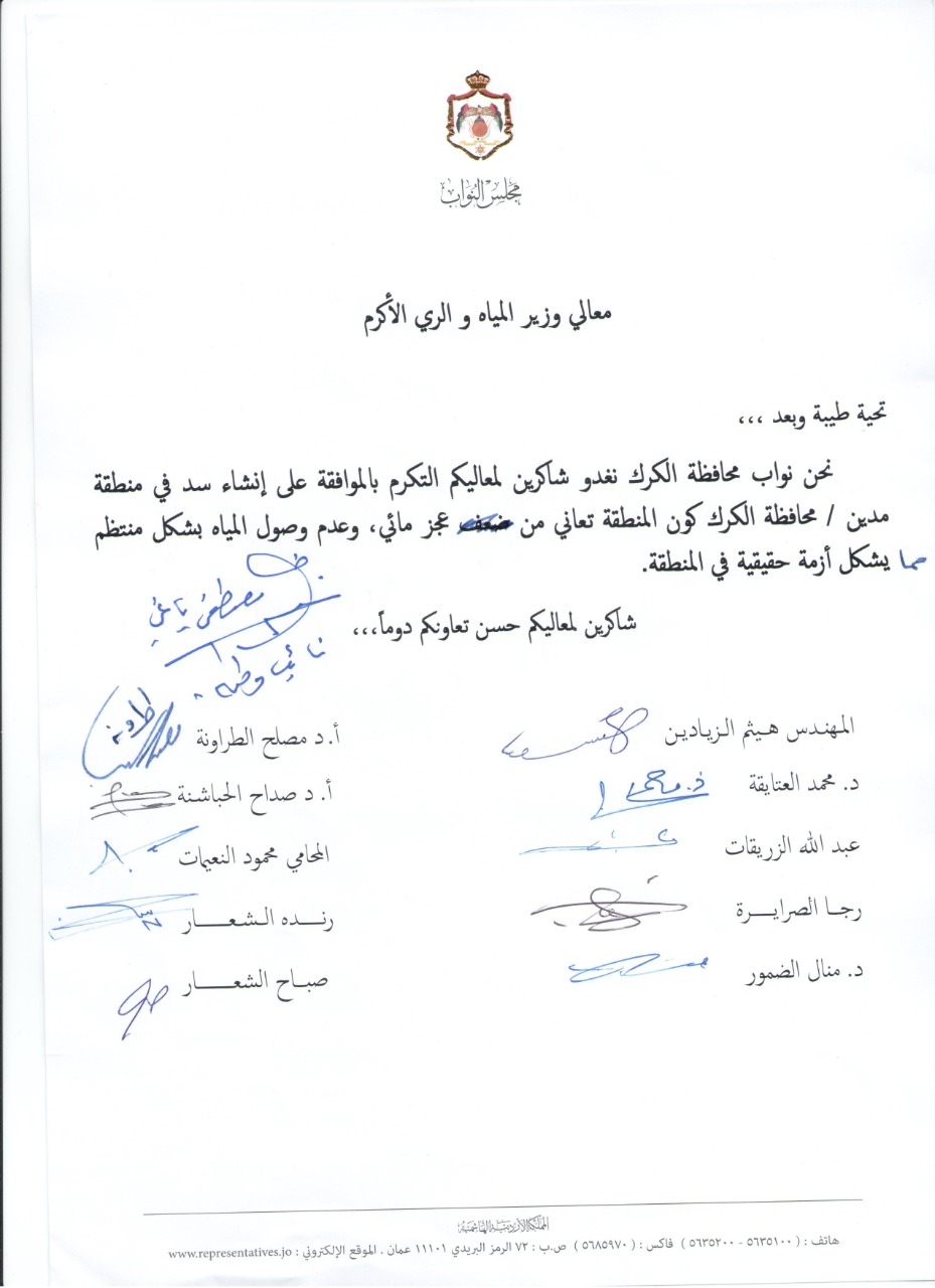 كما طالب النواب من معالي وزير المياه والري بإقامة سد لجمع مياه الامطار في منطقة مدين كون المنطقة تعاني من نقص شديد بالمياه مما يؤدي لازمة حقيقية باستمرار .