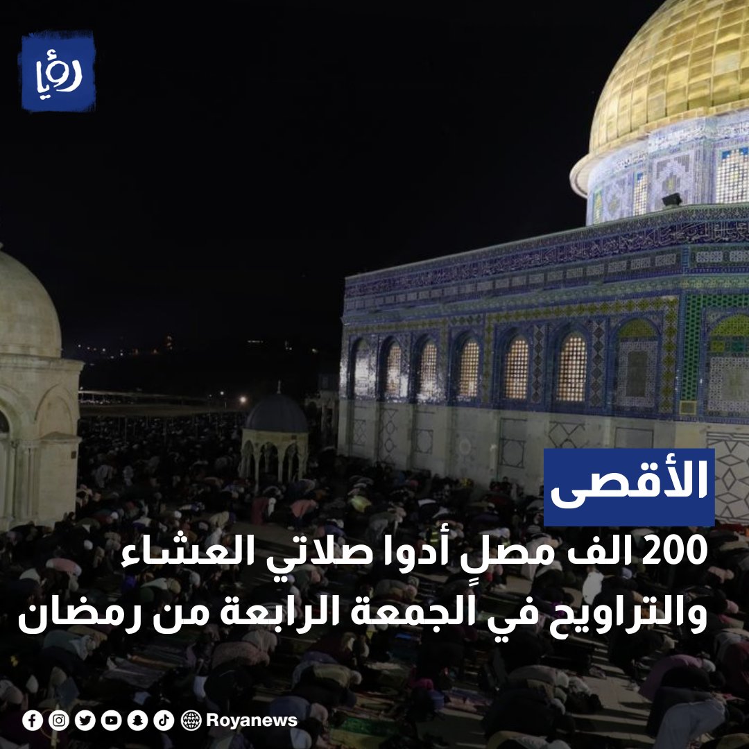 وقالت دائرة الأوقاف الإسلامية في القدس: إن نحو 200 ألف فلسطيني أدوا صلاة العشاء والتراويح في المسجد الأقصى هذه الليلة.