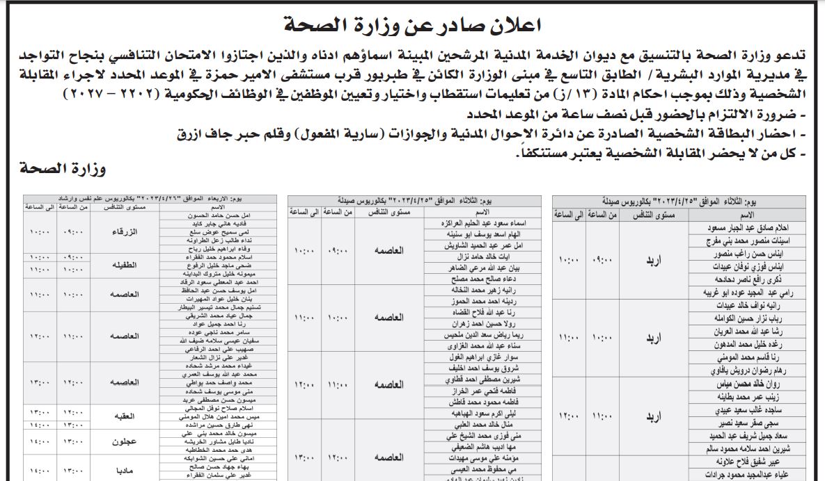 مدعوون لإجراء المقابلات الشخصية في وزارة الصحة - أسماء
