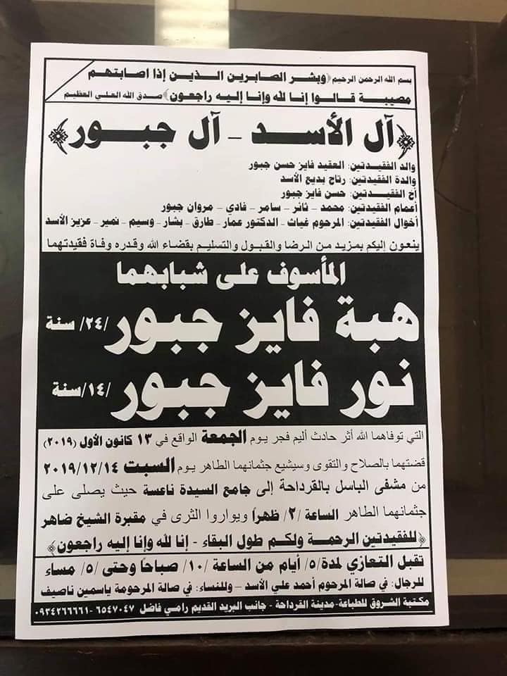 قتلت الشقيقتان نور وهبة جبور، في القرداحة بريف اللاذقية، فيما أصيب شقيقهما الوحيد حسن بجروح خطيرة. وثلاثتهم أبناء رتاج الأسد ابنة بديع الأسد عم سيادة الرئيس الدكتور بشار الاسد .