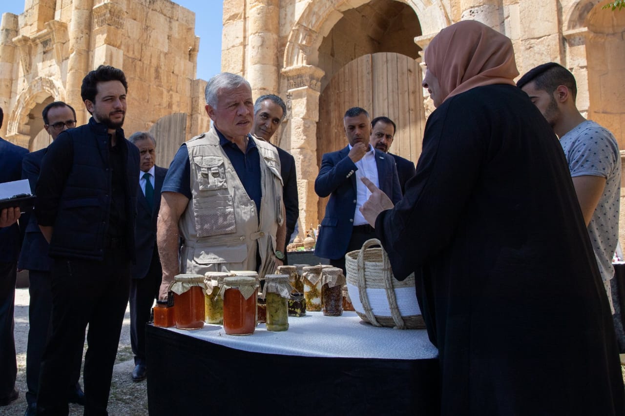 واطلع جلالة الملك وسمو ولي العهد على بازار لمنتجات الجمعيات والمجتمع المحلي، ومعرض للقطع الأثرية، مؤكدا جلالته أهمية دعم المنتجات السياحية محلية الصنع داخل المواقع الأثرية.