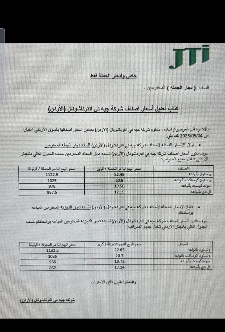 وبين هؤلاء أن الارتفاع جرى من خلال الموزعين، حيث أعلمومهم بالرفع صباح اليوم، لتكون الأسعار كالتالي بحسب رسالة من أحد شركات التوزيع: