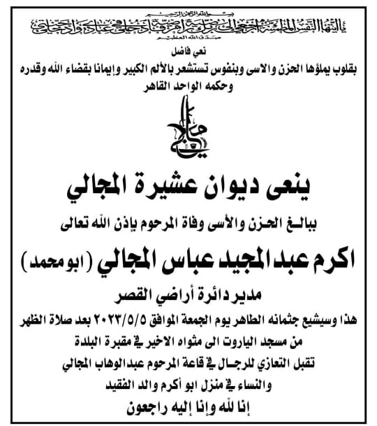 إنتقل الى رحمة االله المأسوف على شبابه "اكرم عبد المجيد المجالي" مدير عام أراضي لواء القصر - محافظة الكرك اثر نوبة قلبيه حادة "اثناء تأديته للوظيفة الرسمية"