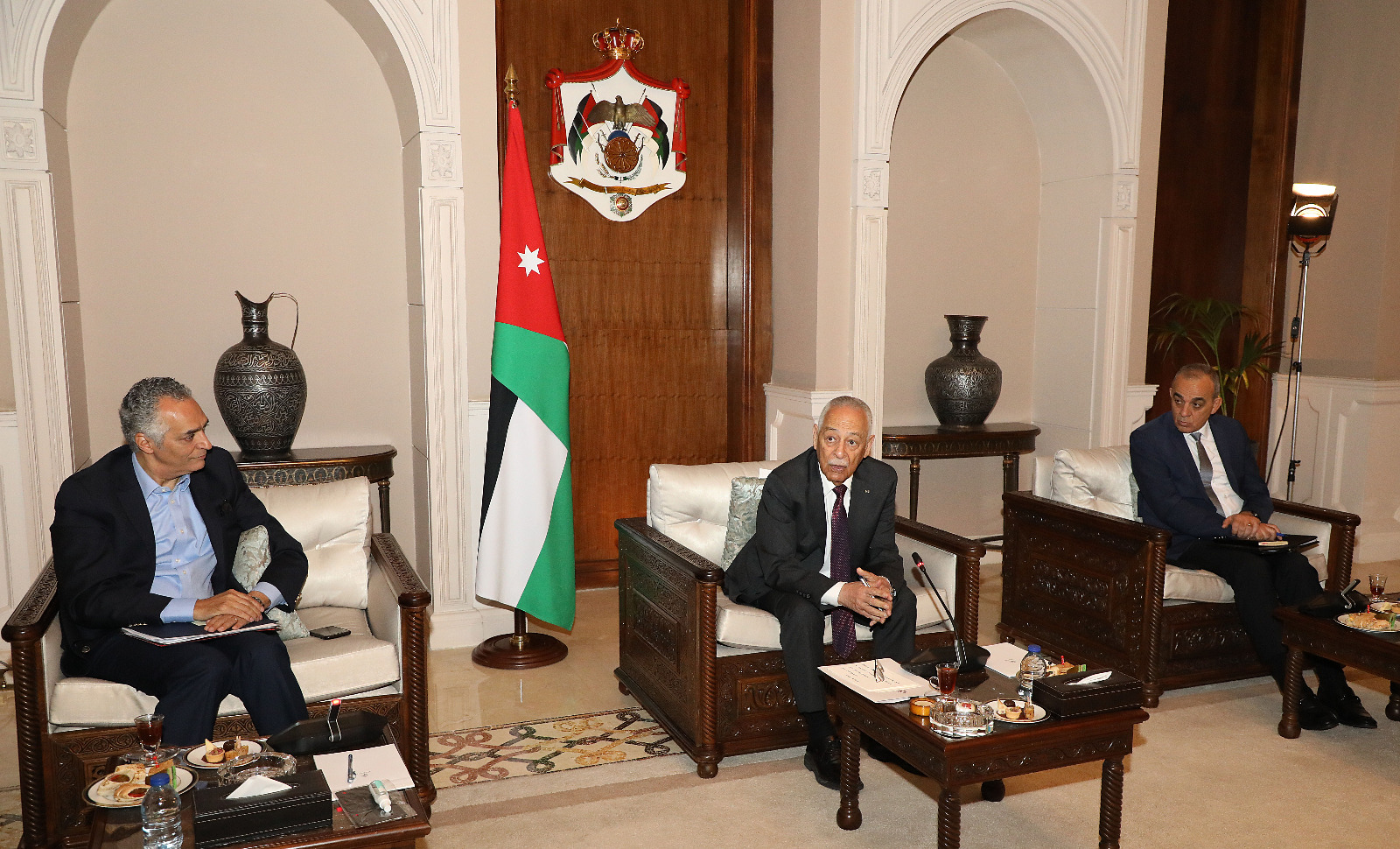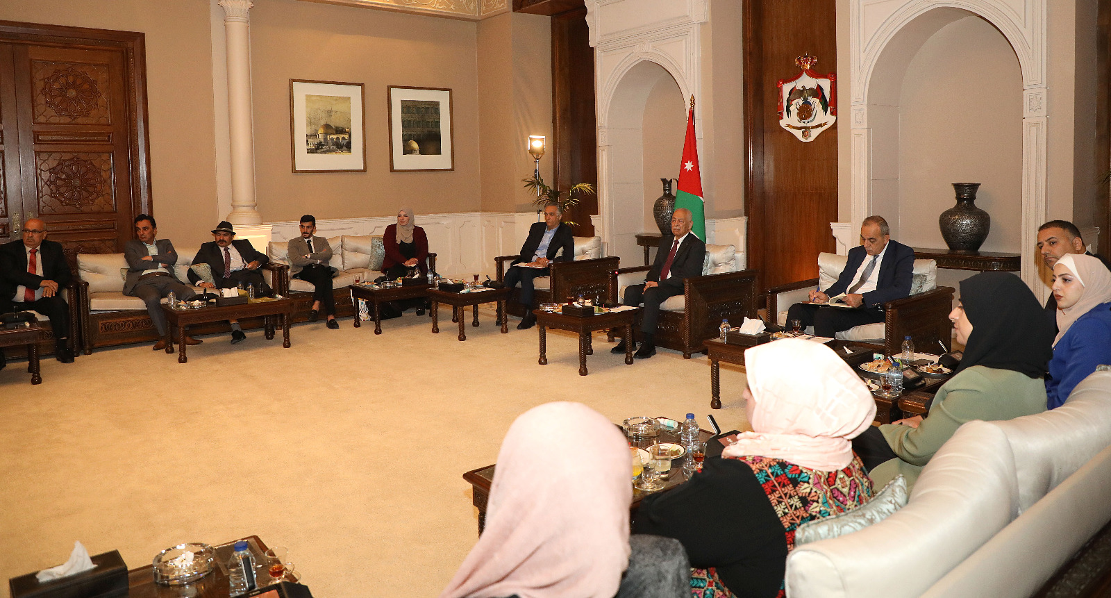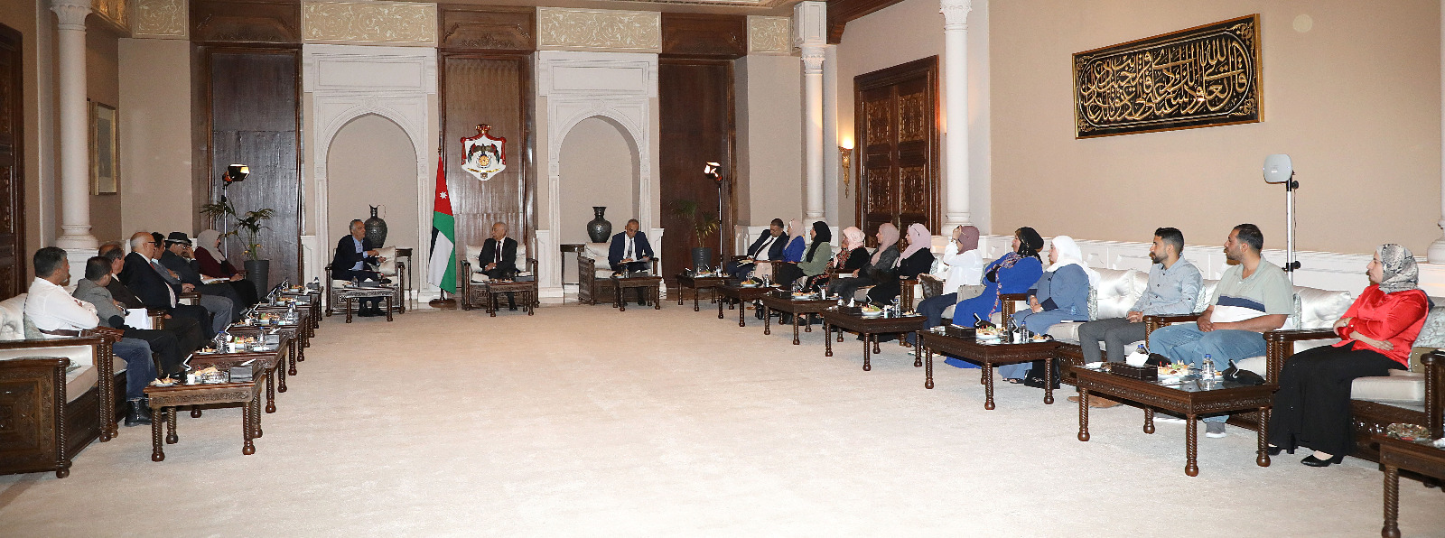 بتوجيهات ملكية، التقى رئيس الديوان الملكي الهاشمي، رئيس لجنة متابعة تنفيذ مبادرات جلالة الملك، يوسف حسن العيسوي، الجمعة، المشاركين في معرض المنتجات الحرفية في الموقع الأثري بمحافظة جرش، لمتابعة الطلبات والمقترحات التي طرحوها خلال زيارة جلالة الملك عبدالله الثاني، وسمو الأمير الحسين بن عبدالله الثاني، ولي العهد، إلى المحافظة الأربعاء الماضي.