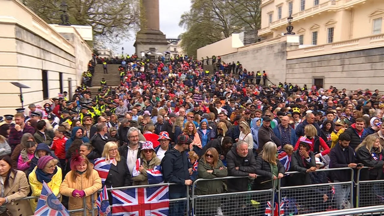 وقبل أيام من تتويج الملك تشارلز الثالث، بدأت أعداد ضخمة تتجمع في وسط لندن. فبعد ظهر يوم الأربعاء، توافد المهنئون ملوحين بالأعلام ويرتدون التيجان.
