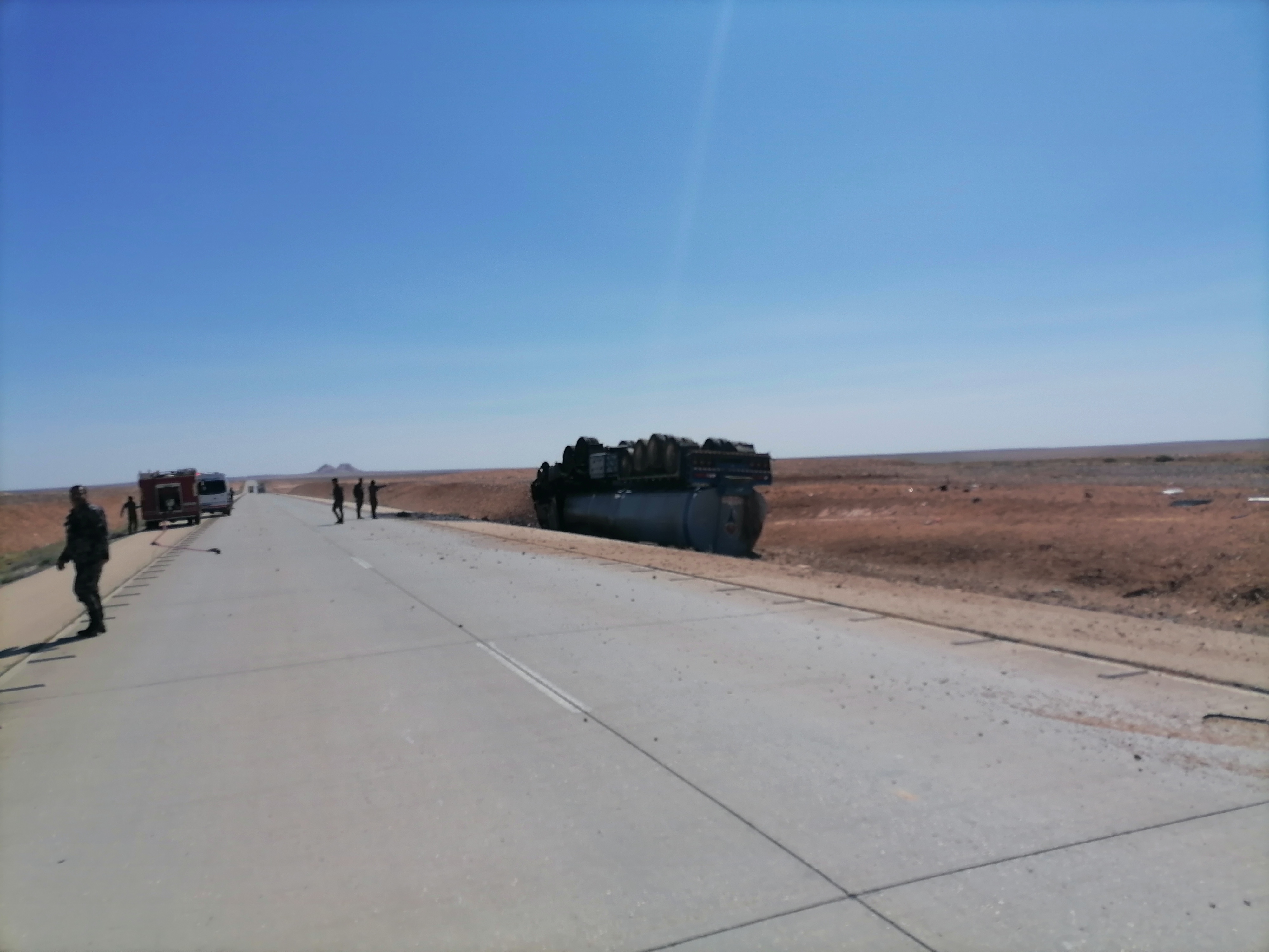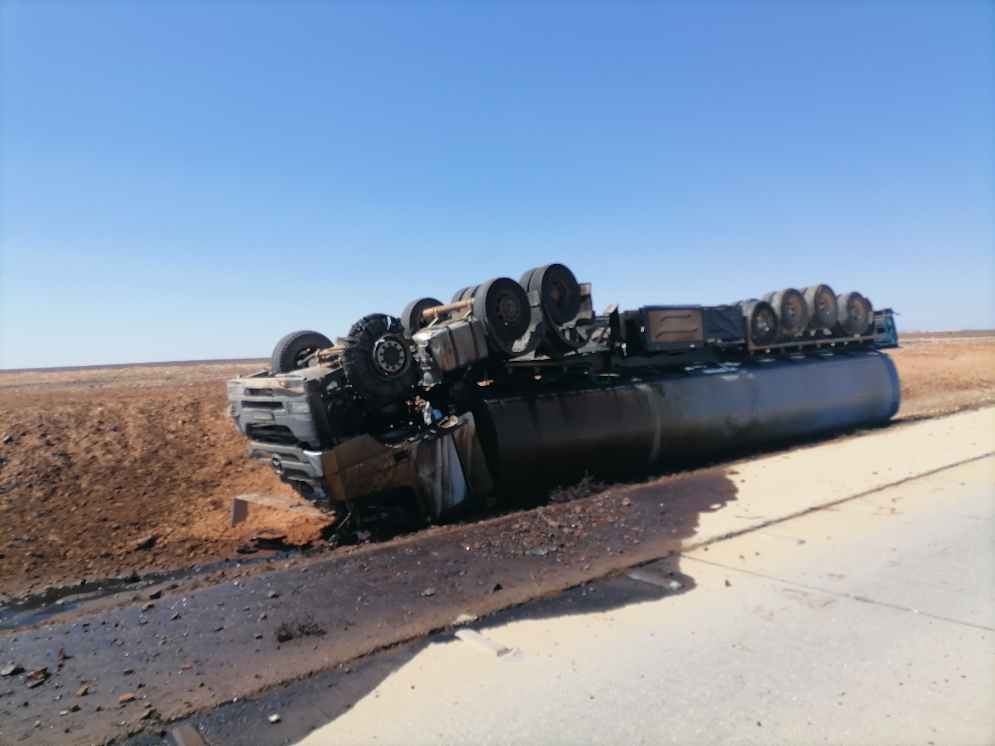 توفي شخص وأصيب اخر إثر تدهور صهريج وقود محمل بمادة T1 على طريق الازرق باير.
