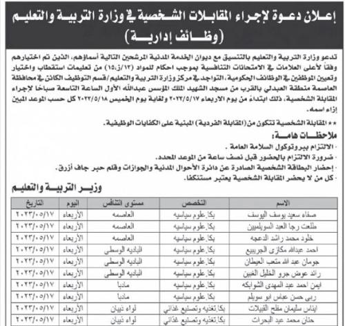 التربية تدعو مرشحين لمقابلات شخصية .. أسماء
