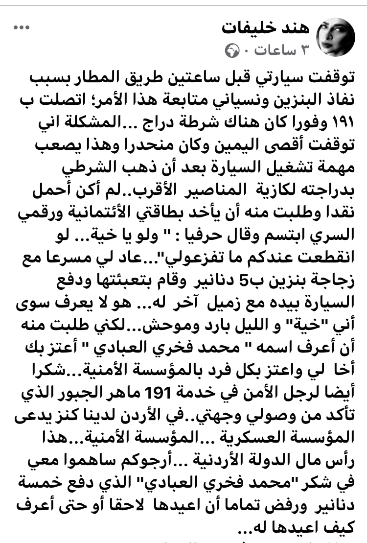 وفي تفاصيل القصة قالت المواطنة "هند خليفات" في منشور لها على فيسبوك: " توقفت سيارتي قبل ساعتين طريق المطار بسبب نفاذ البنزين ونسياني متابعة هذا الأمر؛ اتصلت ب ١٩١ وفورا كان هناك شرطة دراج ...المشكلة اني توقفت أقصى اليمين وكان منحدرا وهذا يصعب مهمة تشغيل السيارة بعد أن ذهب الشرطي بدراجته لكازية المناصير الأقرب..لم أكن أحمل نقدا وطلبت منه أن يأخد بطاقتي الأئتمانية ورقمي السري ابتسم وقال حرفيا : " ولو يا خية... لو انقطعت عندكم ما تفزعولي"...عاد لي مسرعا مع زجاجة بنزين ب5 دنانير وقام بتعبئتها ودفع السيارة بيده مع زميل آخر له... هو لا يعرف سوى أني "خية" و الليل بارد وموحش...لكني طلبت منه أن أعرف اسمه " محمد فخري العبادي " أعتز بك أخا لي واعتز بكل فرد بالمؤسسة الأمنية...شكرا أيضا لرجل الأمن في خدمة 191 ماهر الجبور الذي تأكد من وصولي وجهتي..في الأردن لدينا كنز يدعى المؤسسة العسكرية ...المؤسسة الأمنية...هذا رأس مال الدولة الأردنية ...أرجوكم ساهموا معي في شكر "محمد فخري العبادي" الذي دفع خمسة دنانير ورفض تماما أن اعيدها لاحقا أو حتى أعرف كيف اعيدها له".