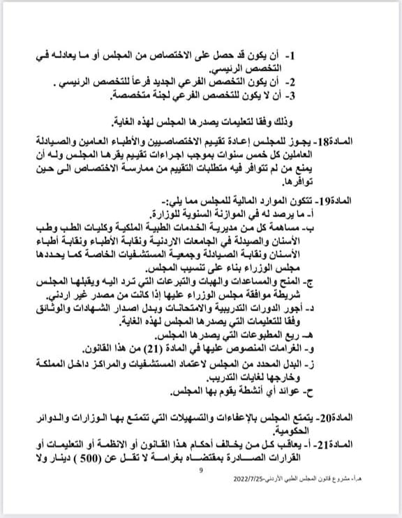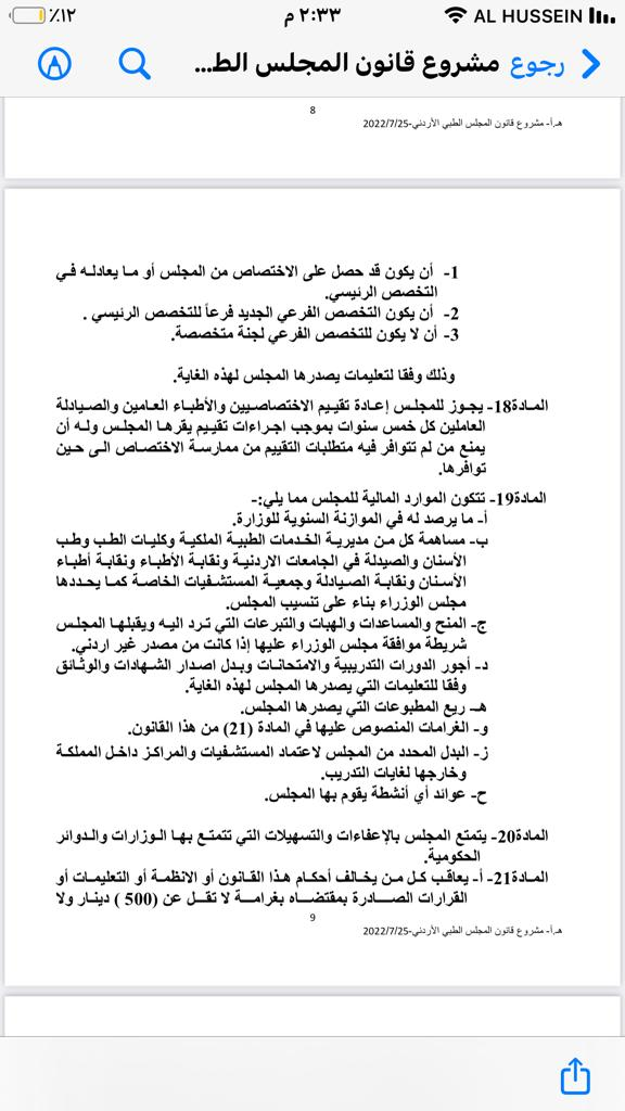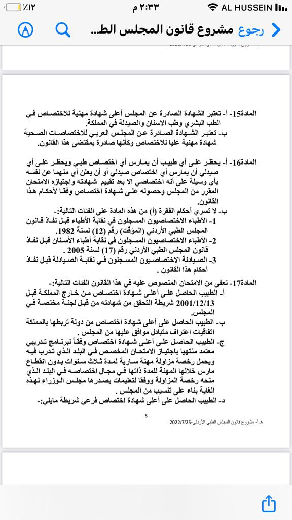نحن مجموعة من أطباء الأردن من حملة البوردات و الشهادات الأجنبية و عددنا يقارب ١٥٠ طبيب نعمل في مستشفيات وزارة الصحة الأردنية و نقوم بكل ما يقوم به الإختصاصي و الإستشاري لوحدنا كل في مكان عمله من عيادات و دخولات و اقسام و عمليات و طوارئ و لكن غير معترف بما نحمل من شهادات فنمارس الإختصاص لكن بمسمى طبيب عام و نتقاضي و نعامل في كل شيء معاملة الطبيب العام حتى قانونيا نحن مدانون بعملنا دون مزاولة مهنة اختصاص و دون اعتراف و تقييم لشهاداتنا إسوة بكل زملائنا اللذين سبقونا و عادلوا لهم شهاداتهم و بورداتهم الأجنبية على عدة فترات قديما و حديثا حتى تم تعديل القانون عندنا ليسمح لمن يحمل شهادة اجنبيةو عمل في الخارج ٣ سنوات ان تعادل شهادته و يمنح مزاولة اختصاص و معادلة و اعتراف في حين تم إقصاءنا نحن في نهج واضح لإستمرار إيقاع الظلم بنا متعمدين رغم المطالبات المستمرة بضرورة تحقيق العدالة للجميع و عدم التفريق في المعاملة و الإعفاءات فقط لاننا عدنا الى وطننا لنخدمه و نرى في كل ما يحدث تجاهنا ضرب واضح من الظلم و التمييز القسري و ما يتعارض مع حقوق الإنسان و بما يؤثر على المريض الذي نعالج حيث ان الطبيب الغير قانوني حتما سترتجف يداه و تكبل عن العطاء و تقديم الخدمة العلاجية .