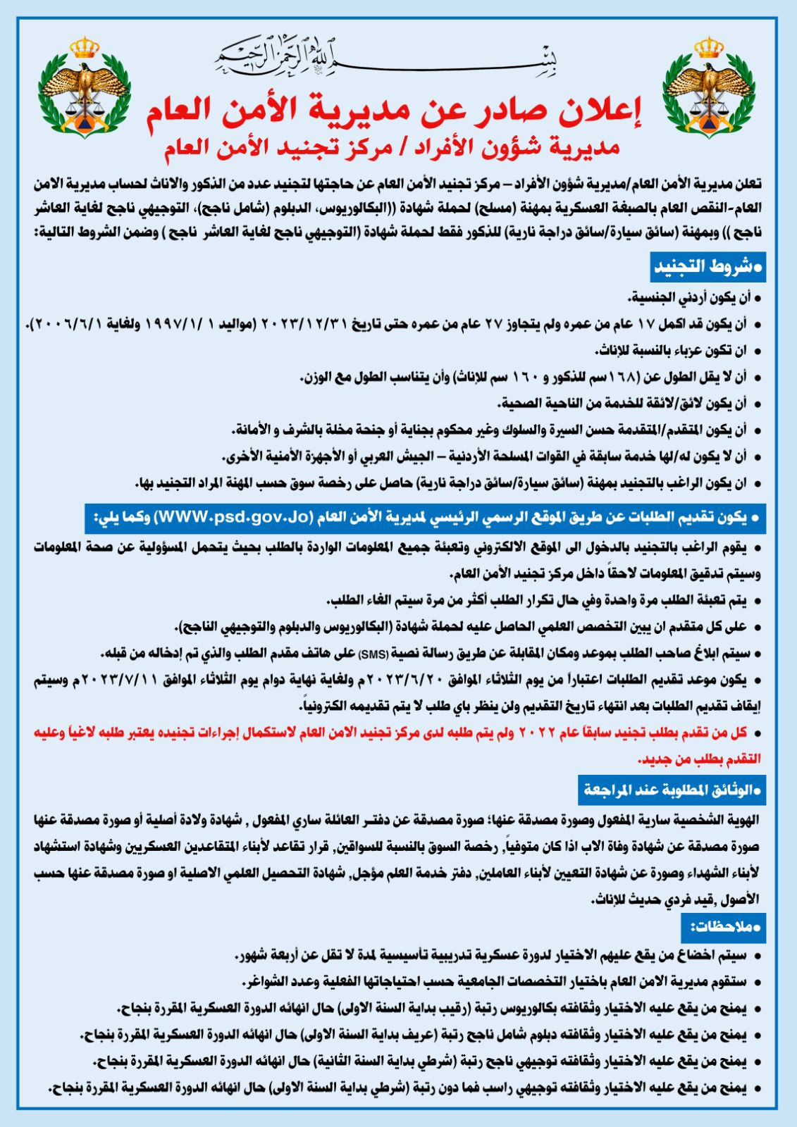و يكون تقديم الطلبات فقط عن طريق الموقع الرسمي الرئيسي لمديرية الأمن العام (WWW.psd.gov.Jo) واعتباراً من يوم غد الثلاثاء الموافق 20/ 6/ 2023.