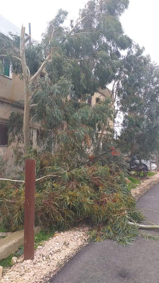 نتيجة لشدة سرعة الرياح وقوتها التي رافقت سيادة حالة عدم الاستقرار الجوي على مناطق بلواء بني كنانه؛ فقد سقطت اشجار على محولات كهربائية ومنازل وشوارع في عدد من مناطق اللواء دون وقوع إصابات بشرية جراء ذلك.