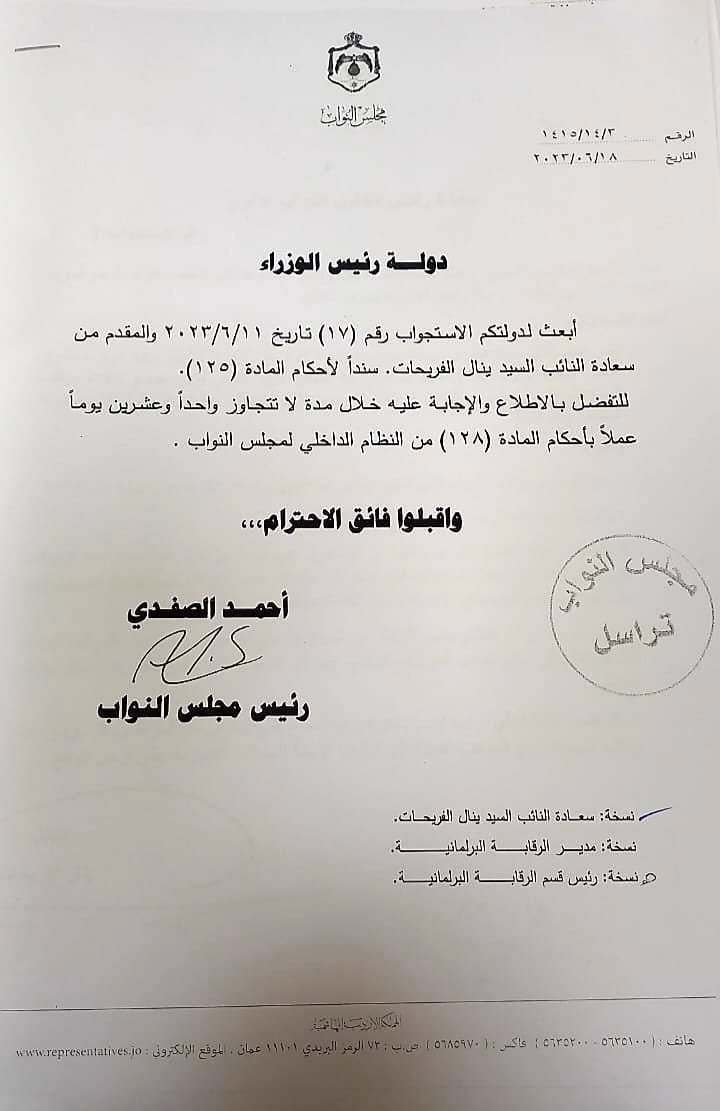أحال النائب ينال فريحات السؤال الذي وجهه إلى أمانة عمان حول الصندوق الخاص لإنشاء مواقف عامة للسيارات إلى استجواب بسبب تجاوز الأمانة للمدة القانونية المخصصة للإجابة والبالغة شهراً.