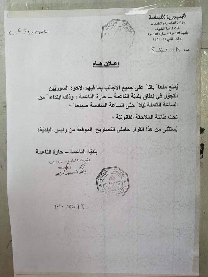 من جانبها فرضت بلدية "الناعمة" تكتما شديدا على التعاطي بتفاصيل الجريمة واكتفت بنشر بيان تحظر فيه التجول في حارة "الناعمة" للأجانب ومنهم السوريون من الساعة 8 مساء حتى 6 صباحا باستثناء الأشخاص الذين حصلوا على تصاريح خطية موقعة أصولا من رئيس للبلدية.