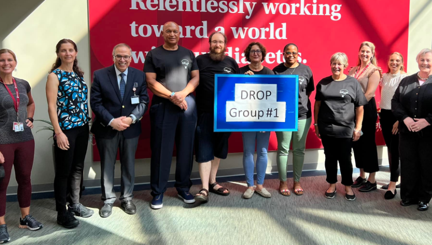 (الصورة لاول مجموعة تشفى من السكر وفريق العمل معي بمركز جوزلين بجامعة هارفارد الأمريكية، والخلفية تحمل شعار المركز: نعمل باصرار للوصول الى عالم بلا سكر)
